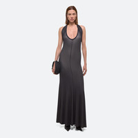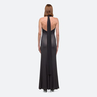 Halter-neck dress with an exaggerated tie detail that wraps around the body and over the shoulders. Contrasting textures that shift with every move, as the white base layer peeks through the sheer hosiery-inspired outer layer. Fits true to size. Model is 6’1” and wears size S DETAILS - Two-layer construction - Halter neck ties in back - Deep U-neck - Full length - Close fit through waist and hips - O07HW605 MATERIALS & CARE - Composition: 90% Viscose, 10% Elastane - Spot clean only. - Finished Garment Manufacturing Country/Region: China - Fabric Production Country/Region: Italy - Weaving Country/Region: (of fabric) Italy - Dyeing Country/Region: (of fabric) Italy - Finishing Country/Region: (of fabric) Italy