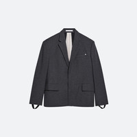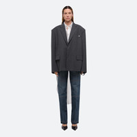 Classic blazer in a wool flannel melange. Oversized single-breasted fit with peak lapels and flap pockets. Wear the jacket like a backpack using the adjustable interior straps, inspired by bomber jackets. This garment was designed with a unisex fit so you can express your unique style. Fits oversized. Male model is 6’1” and wears size M. Female model is 6’1” and wears size S. DETAILS - Peak lapels - Flap pockets - Front welt pocket with metal logo clip - Interior welt pocket - Button front closure - Adjustable interior shoulder straps - Detachable sleeve thumb-pulls - Vent at back - Fully lined - Oversized fit - O10HW197 MATERIALS & CARE - Composition: 75% Recycled Wool, 25% Polyamide - Professional dry clean only. Do not steam. - Finished Garment Manufacturing Country/Region: China - Fabric Production Country/Region: Italy - Weaving Country/Region: (of fabric) Italy - Dyeing Country/Region: (of fabric) Italy - Finishing Country/Region: (of fabric) Italy