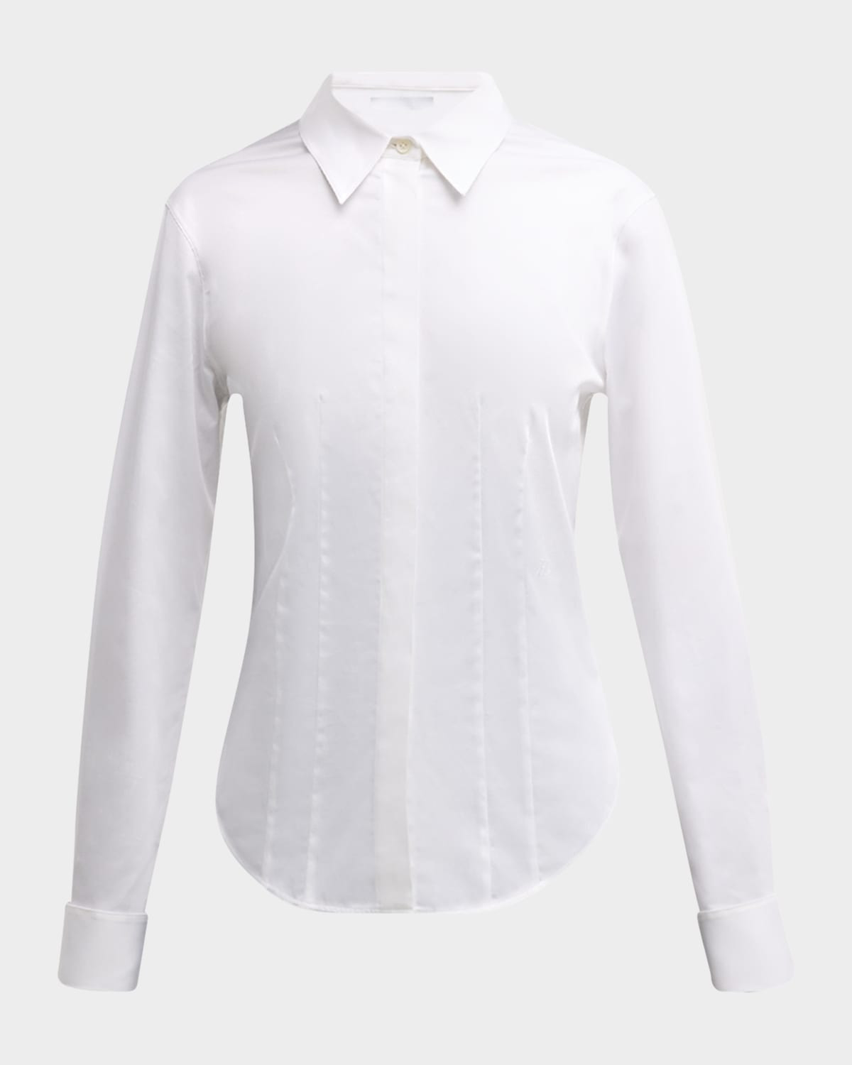 - Helmut Lang seamed shirt in stretch-cotton - Point collar - Long sleeves; button cuffs; - approx. 27.3"L - Fitted silhouette - Rounded hem - Button-front - Cotton/elastane - Dry clean, professional cleaning recommended - Imported - Size Note: • Model Height: 5'10"/ waist 24”/ hips 36"/ bust 32" • Model is wearing size Small