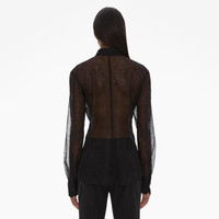 The Helmut Lang Shirt is a fitted long-sleeve style in lace with a point collar, button front closures, and cuffs. DETAILS - 100% Polyester - Pointed collar - Long sleeves - Button front closures - Imported - N09HW508 CARE - Professional dry clean only FIT - Fits true to size - Model is 5’10” and is wearing size S