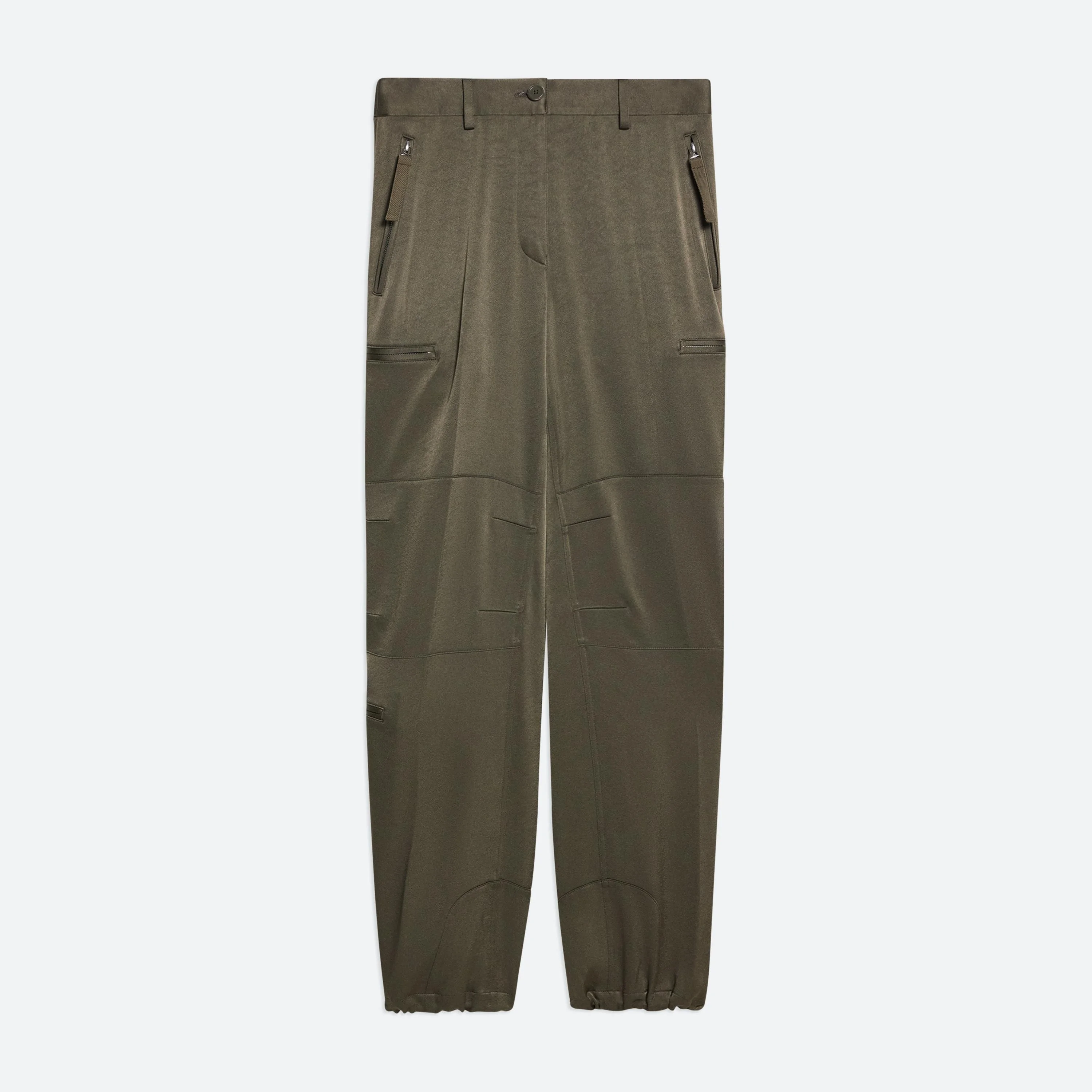 Mid-rise utility pants in crepe-backed satin. Inspired by the tactical details of aviation flight suits, with articulated knees and zip pockets throughout. Cinch the bungee cords at the ankle for a parachute fit. Fits true to size. Model is 5’11” and wears size S. DETAILS - Mid-rise - Straight leg - Zip fly with button closure - Articulated knee patch - Belt loops - Side pockets with zipper pull - Back patch pockets - Zippered pockets throughout - Bungee cord ankle closures - Hidden elastic waistband at back - 31 1/2” inseam and 19 1/2” leg opening - O09HW203 MATERIALS & CARE - Composition: 82% Triacetate, 18% Polyester - Professional dry clean only. Do not steam. - Finished Garment Manufacturing Country/Region: China - Fabric Production Country/Region: Japan - Weaving Country/Region: (of fabric) Japan - Dyeing Country/Region: (of fabric) Japan - Finishing Country/Region: (of fabric) Japan