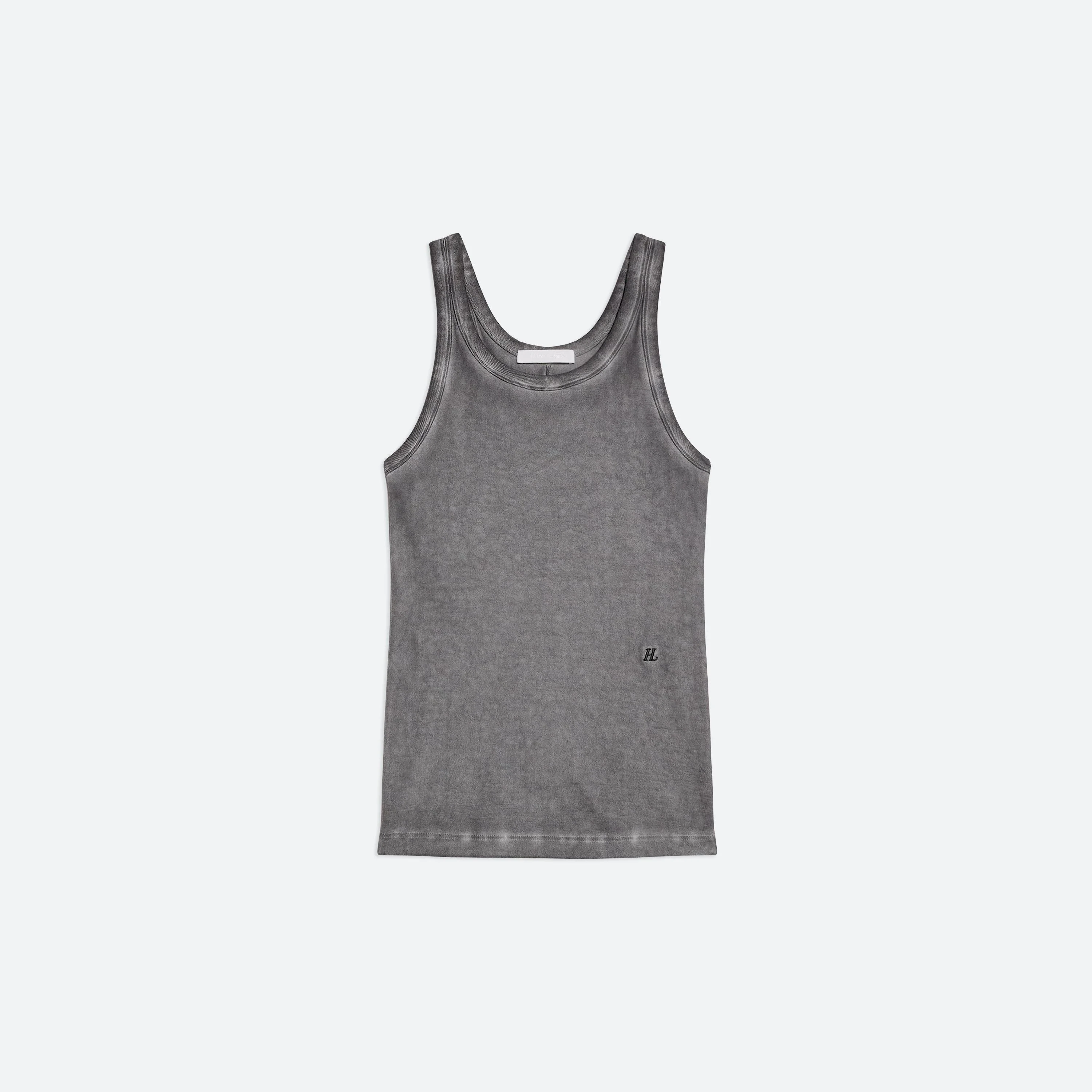 Supersoft cotton-modal tank in an ultra-fine rib. A garment dyeing process gives each piece a unique wash with vintage depth, highlighted by soft chalk-line distressing at the seams. Fits true to size. Model is 5’11” and wears size S. DETAILS - Scooped neck - Slim fit - Sleeveless racerback style - Tonal HL logo embroidered at front - O10HW506 MATERIALS & CARE - Composition: 100% Pima Cotton - Machine wash cold gentle cycle with like colors. Do not bleach. Tumble dry low. Cool iron if needed. Do not dry clean. - Finished Garment Manufacturing Country/Region: Peru - Fabric Production Country/Region: Peru - Weaving Country/Region: (of fabric) Peru - Dyeing Country/Region: (of fabric) Peru - Finishing Country/Region: (of fabric) Peru