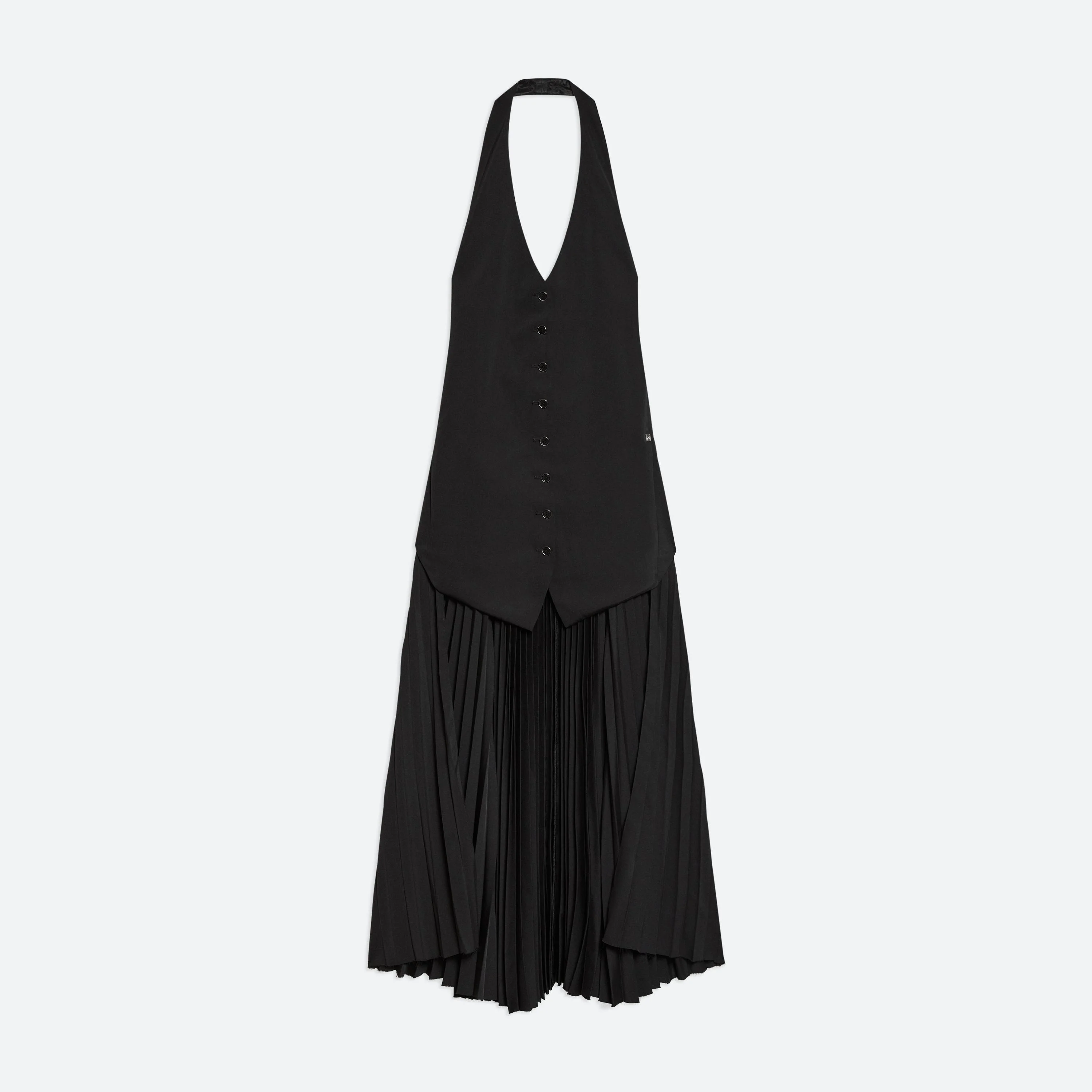 Halter-neck dress in fluid twill with a full-length pleated skirt in back. Tie in the back for a wrapped effect, or in front for a layered look. Fits true to size. Model is 5’10” and wears size 2. DETAILS - Halter neck - Deep v-neck - Open back with ties at waist - Full-length skirt with open front - Pressed sunburst pleats - Button front closure - Hidden elastic waistband in back - In-seam side pockets with metal logo clip - P01HW604 MATERIALS & CARE - Composition: 52% recycled polyester, 48% polyester; lining: 100% viscose - Do not wash, do not bleach, do not tumble dry, do not iron, dry clean with any solvent except trichloroethylene - Finished Garment Manufacturing Country/Region: China - Fabric Production Country/Region: China - Weaving Country/Region: (of fabric) China - Dyeing Country/Region: (of fabric) China - Finishing Country/Region: (of fabric) China