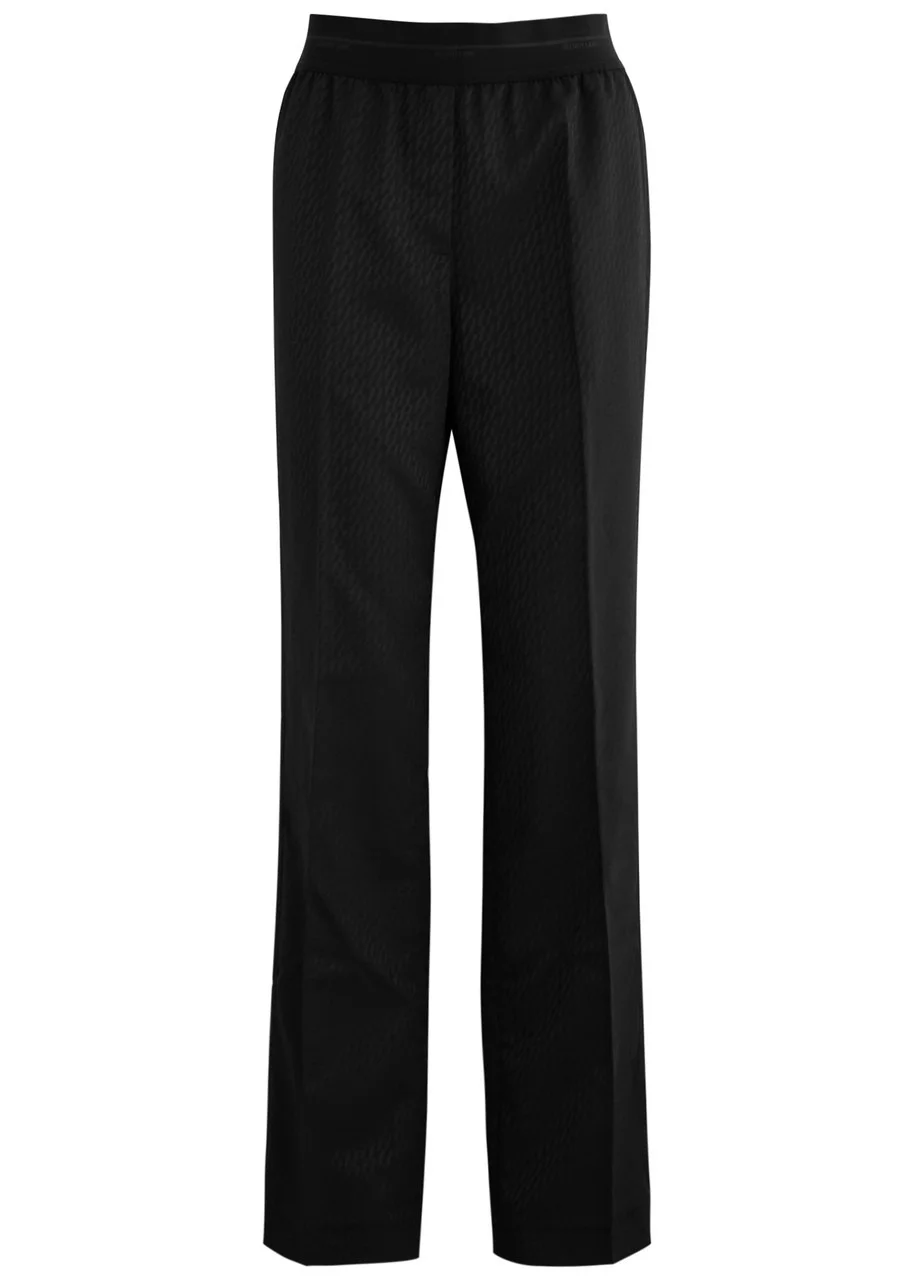 Info & Care Helmut Lang woven;trousers Logo-monogrammed jacquard, elasticated logo-jacquard waistband, side slip pockets, back patch pocket with designer plaque Pull on 73% polyester, 25% wool, 2% elastane Dry clean Size & Fit Inside leg length: 33;inches/ 84cm Midweight Straight-leg cut Model is 5'10"/ 178cm and wears a sizeUS4