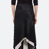 Asymmetrical layered skirt in glossy satin, laser-cut with a hole-punch texture that reveals the white lining beneath as it moves. Cut on the bias for a fluid drape and finished with a scarf hem. Fits true to size. Model is 5'9.5" and wears size 2 DETAILS - In-seam pockets - Bias cut - Side zip closure - Logo lining - O07HW301 MATERIALS & CARE - Composition: 82% Viscose, 18% Rayon - Professional dry clean only. - Finished Garment Manufacturing Country/Region: China - Fabric Production Country/Region: China - Weaving Country/Region: (of fabric) China - Dyeing Country/Region: (of fabric) China - Finishing Country/Region: (of fabric) China