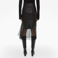 The Helmut Lang Skirt is a midi pencil style that’s paneled in smooth leather with a side zip closure and a draped lace hem. DETAILS - 100% Sheep Leather - Asymmetrical lace-trimmed hem - Side zip closure - Imported - N09HW302 FIT - Fits true to size - Model is 5’10” and is wearing size 2