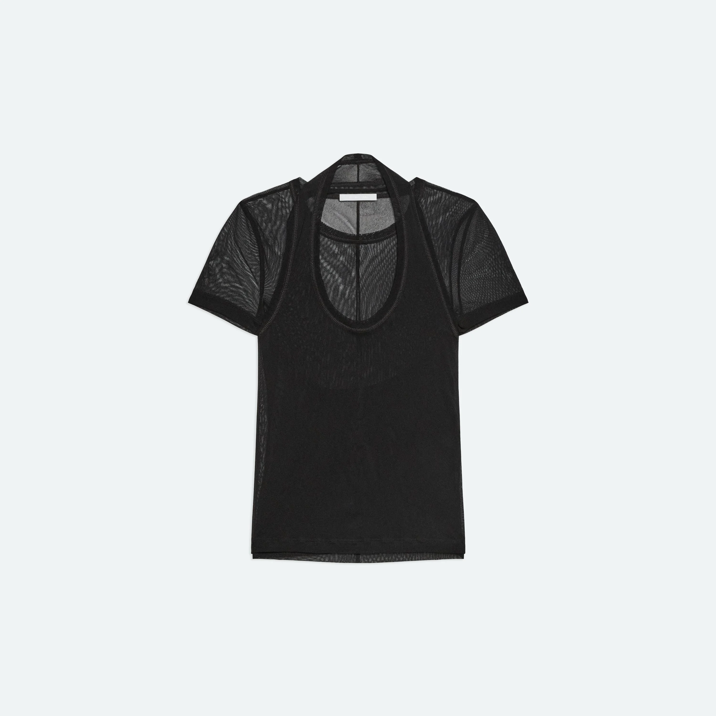 A sheer halterneck layered over a fitted mesh baby tee. Wear each piece on its own, or together for a look with contrasting sheer and opaque elements. Fits true to size. Model is 5'9" and wears size S. DETAILS - Top layer: halterneck tank top - Base layer: crewneck baby tee - Separate pieces arrive attached - Q02HW511 MATERIALS & CARE - Composition: 100% polyamide - Hand wash cold, inside-out. Do not bleach. Do not tumble dry. Cool iron if needed. Do not dry clean. Lay flat to dry. - Finished Garment Manufacturing Country/Region: Portugal - Fabric Production Country/Region: Portugal - Dyeing Country/Region: (of fabric) Portugal - Finishing Country/Region: (of fabric) Portugal