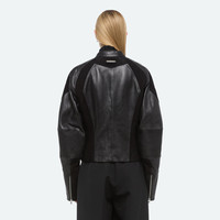 Leather jacket with suede panels. Inspired by protective BMX gear, with an articulated construction that creates a rounded shoulder and a fitted waist. Fits true to size. Model is 5'10" and wears size S. DETAILS - Nappa leather - 2-way zipper closure - Stand collar with snap closure - Metal logo zippers at wrists - Ribbed leather elbow patches - Fully lined - Metal logo plate at back - P07HW103 MATERIALS & CARE - Composition: 100% lamb leather; lining: 100% viscose - Professional leather clean only. - Finished Garment Manufacturing Country/Region: India - Fabric Production Country/Region: India