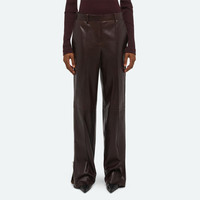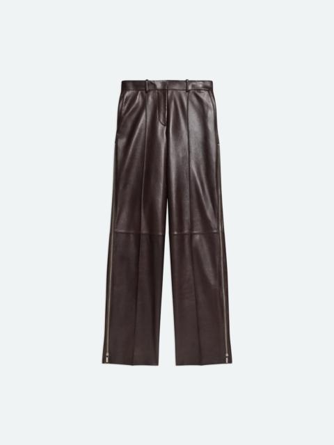 Tailored trousers made in a jersey-bonded leather. Control the shape of the leg with metal zippers that run up the outer seams. Fits true to size. Model is 5'11" and wears size 2. DETAILS - Contrast bonded jersey interior - Mid-rise - Zip fly with hook and bar closure - Pintucked crease on front - Slip pockets on sides - Welt back pockets - Straight fit - 31” inseam and 19 ½” leg opening - P09HW201 MATERIALS & CARE - Composition: 100% lamb leather - Professional leather clean only. - Fabric Production Country/Region: India - Dyeing Country/Region: (of fabric) India - Finishing Country/Region: (of fabric) India