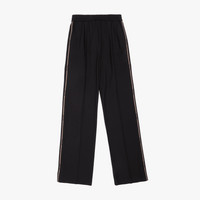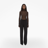 The Helmut Lang Suit Pant is a wide-leg style in stretch wool blend with a pleated pull-on waistband, HL logo piping at side, side slash and back welt pockets. DETAILS - 53% Polyester, 43% Virgin Wool, 4% Elastane - High-rise - Pleated pull-on waistband - Side HL logo piping -Side slash pockets -Back welt pockets - Wide-leg silhouette - Imported - N06HW205 CARE - Professional dry clean only FIT - Fits true to size - Rocio is 5’10” and is wearing size 2