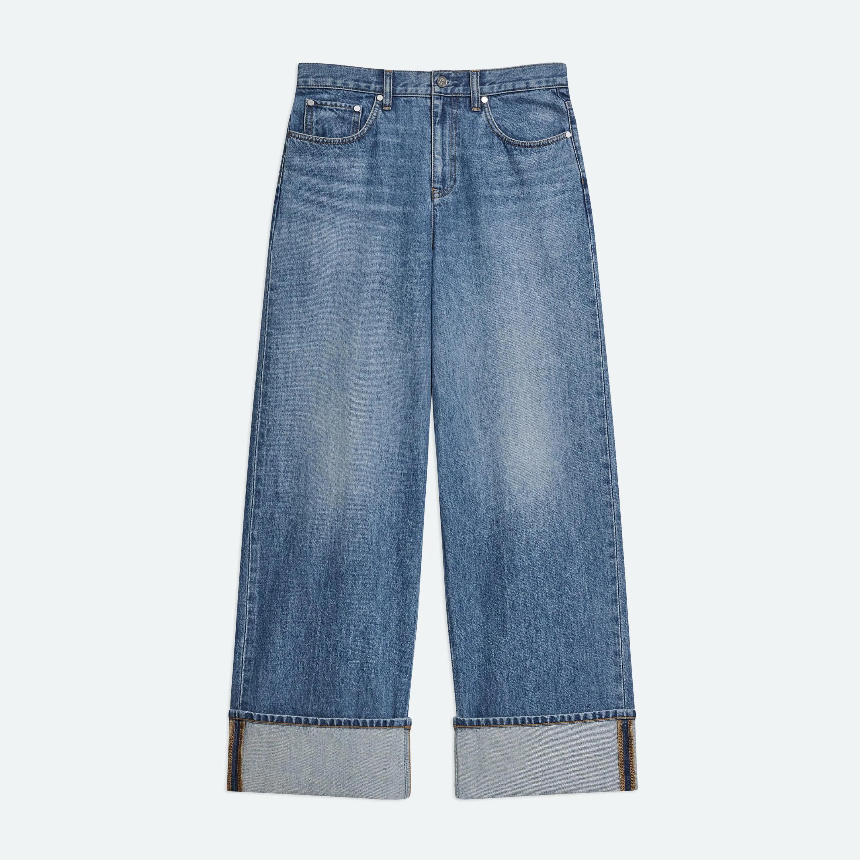 Low-rise jeans with a dropped crotch and exaggerated cuffs. Fits true to size. Model is 5'11" and wears size 26. DETAILS - Oversized folded cuffs - Zip fly with button closure - Classic five-pocket style - Belt loops - Slightly dropped crotch - Leather logo patch on back - Straight leg - 31” inseam and 24 ½” leg opening - P09DW204 MATERIALS & CARE - Composition: 100% cotton - Machine wash cold, gentle cycle, with like colors. Wash inside-out. Do not bleach. Hang to dry in shade. Cool iron if needed. Dry clean with any solvent except trichloroethylene. Do not tumble dry. - Fabric Production Country/Region: Italy - Weaving Country/Region: (of fabric) Italy - Dyeing Country/Region: (of fabric) Italy - Finishing Country/Region: (of fabric) Italy