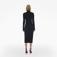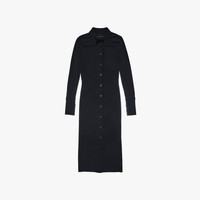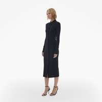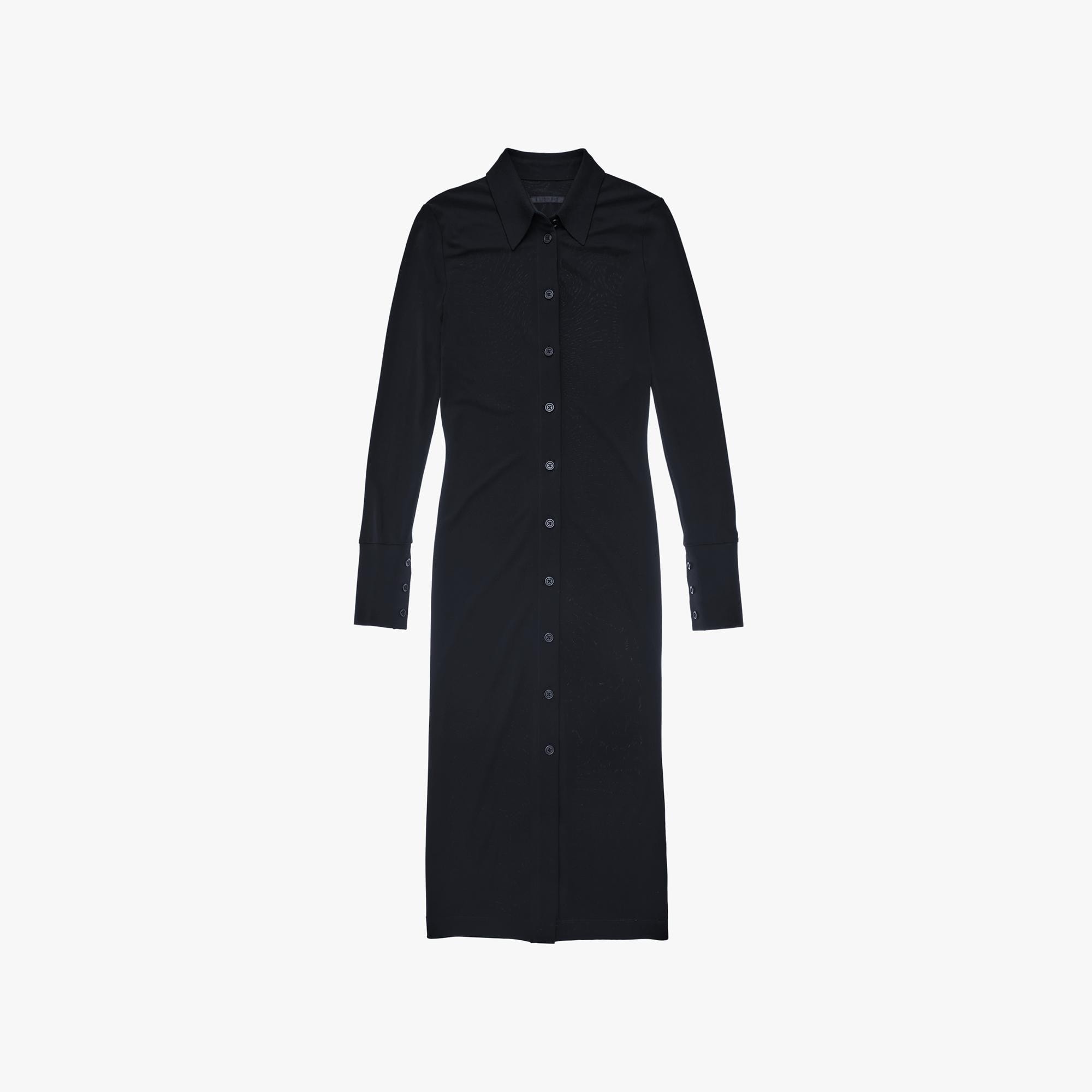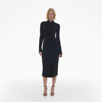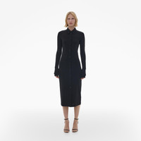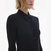 The Helmut Lang Midi Shirt Dress is a slim-fitting style in a lightweight viscose jersey that is detailed with a knit pointed collar and extended button cuffs, long sleeves, and button front closures. DETAILS - 100% Viscose - Pointed knit collar and cuffs - Long sleeves - Button front closures - Imported - N05HW601 CARE - Professional dry clean only FIT - Fits true to size - Jade is 5’9” and is wearing size S