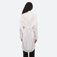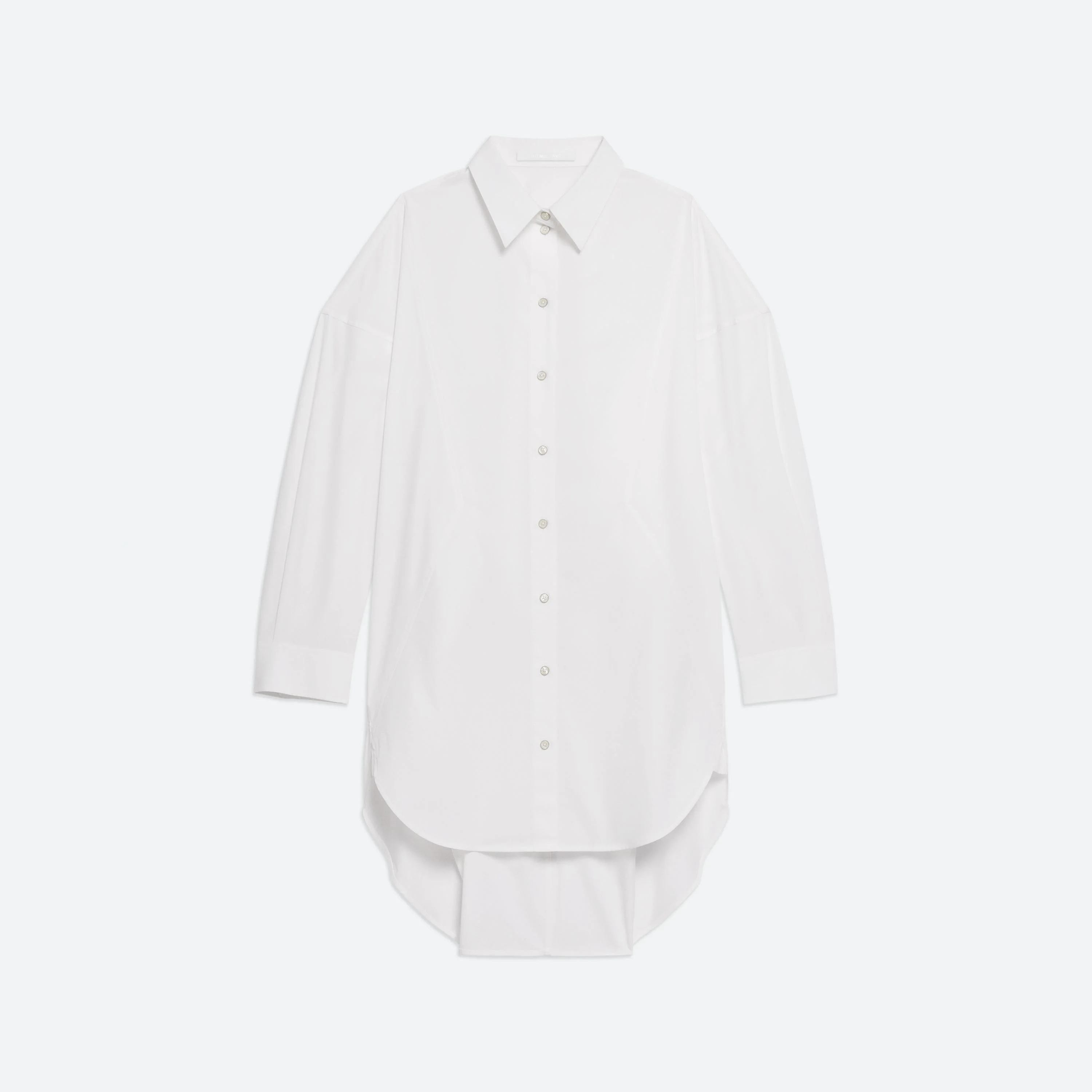 Soft cotton poplin shirt dress with an exaggerated shirttail hem and geometric seaming. Adjust the waist belt in back for a closer fit. Fits true to size. Model is 5’10” and wears size S. DETAILS - Pointed collar - Button front closure and cuffs - High-low hem - Metal-wrapped logo buttons - Oversized fit - P05HW604 MATERIALS & CARE - Composition: 100% cotton - Professional dry clean only. - Finished Garment Manufacturing Country/Region: China - Fabric Production Country/Region: Japan - Weaving Country/Region: (of fabric) Japan - Dyeing Country/Region: (of fabric) Japan - Finishing Country/Region: (of fabric) Japan