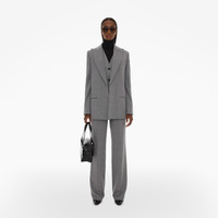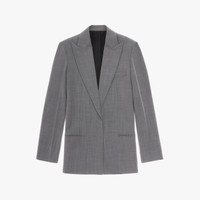 The Helmut Lang Blazer is a tailored style in a herringbone stretch wool blend with stand peak lapels, covered button front closures, back vent, and waist flap pockets. DETAILS - 48% Virgin Wool, 48% Polyester, 4% Elastane - Peak lapels - Long sleeves - Covered front button closures - Waist flap pockets - Back vent - Imported - N09HW106 CARE - Professional dry clean only FIT - Fits true to size - Model is 5’10” and is wearing size 2