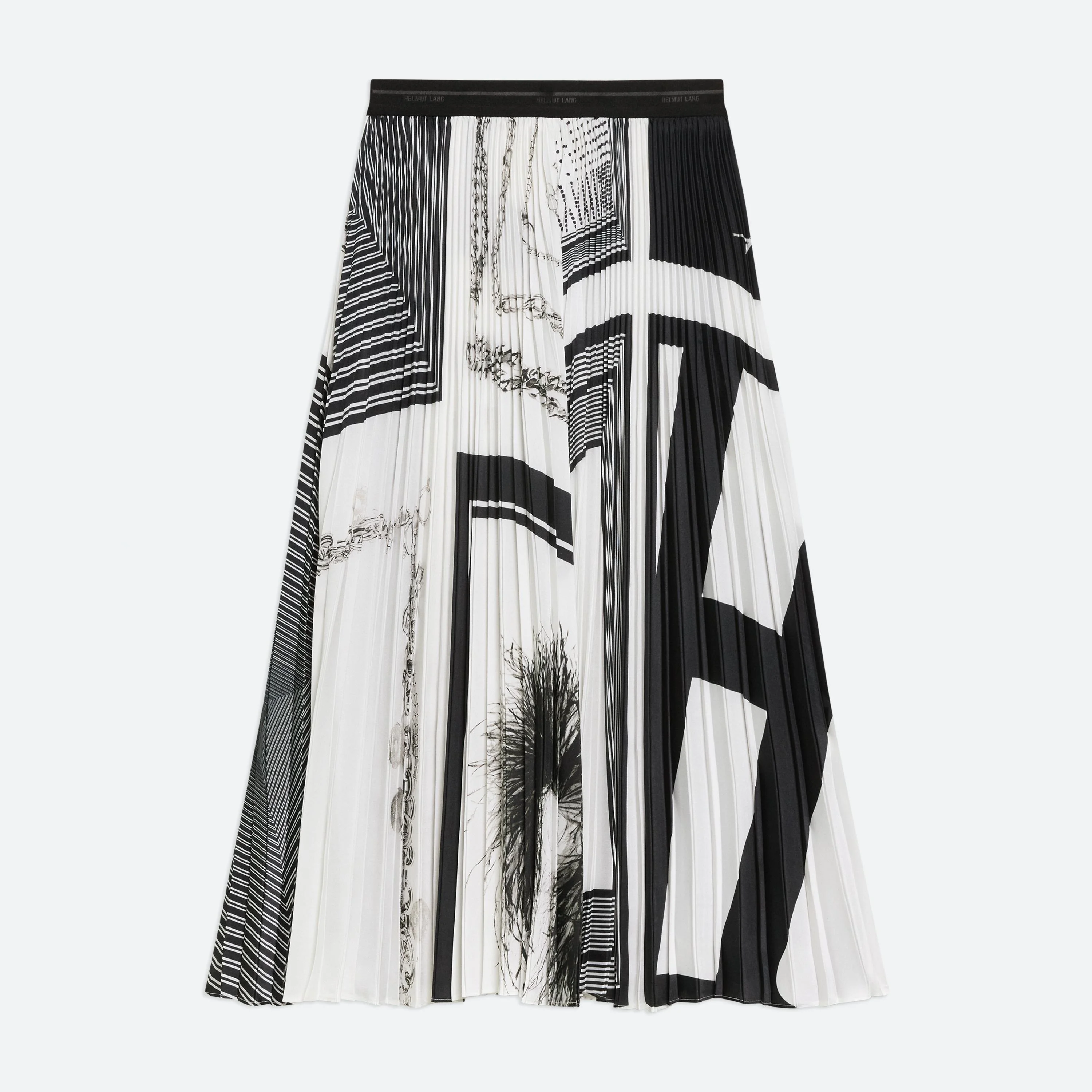 A-line pleated skirt in a custom monochromatic scarf print. Fits true to size. Model is 5’10” and wears size S. DETAILS - Calf-length - Pressed sunburst pleat - Flat knit waistband - P04HW301 MATERIALS & CARE - Composition: 100% recycled polyester - Do not wash. Do not bleach. Do not tumble dry. Do not iron. Dry clean with any solvent except trichloroethylene. - Finished Garment Manufacturing Country/Region: China - Fabric Production Country/Region: China - Weaving Country/Region: (of fabric) China - Dyeing Country/Region: (of fabric) China - Finishing Country/Region: (of fabric) China