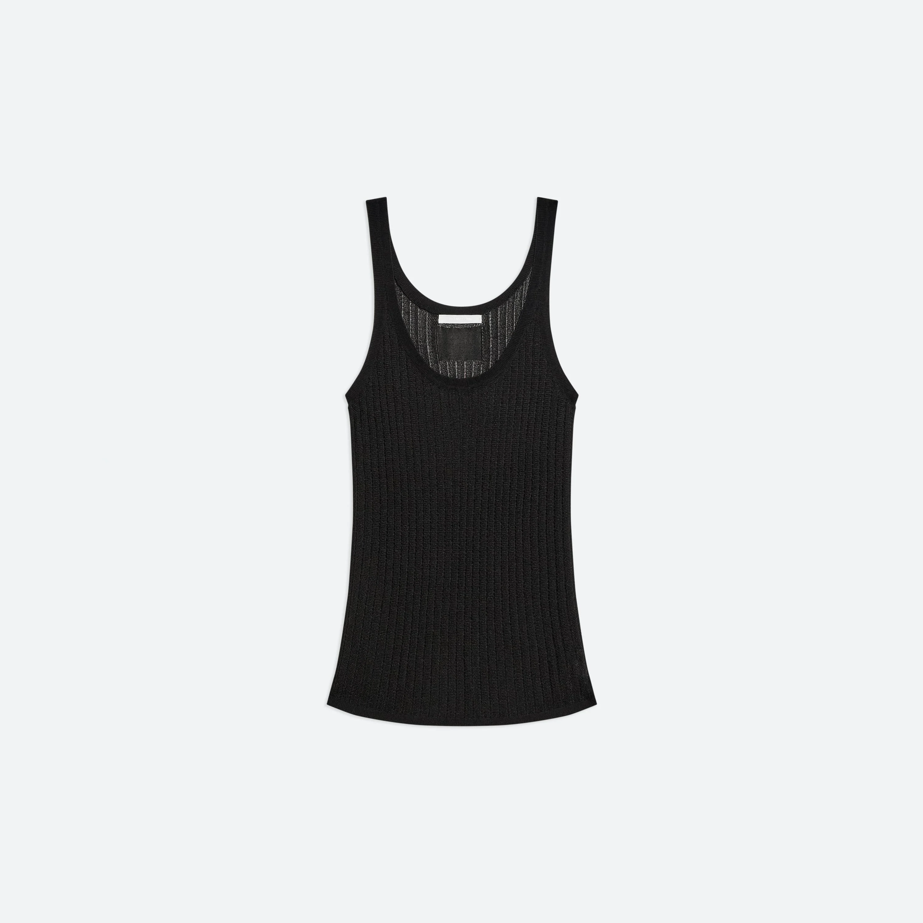 Sheer tank top in pointelle rib knit. Fits true to size. Model is 5’10” and wears size S. DETAILS - Scooped neck - Sheer pointelle rib knit - Ribbed collar, straps, and hem - Relaxed fit - P02HW705 MATERIALS & CARE - Composition: 88% viscose, 12% nylon - Dry clean with any solvent except trichloroethylene - Finished Garment Manufacturing Country/Region: China - Fabric Production Country/Region: China - Dyeing Country/Region: (of fabric) China - Finishing Country/Region: (of fabric) China - Spinning: (of fabric) China