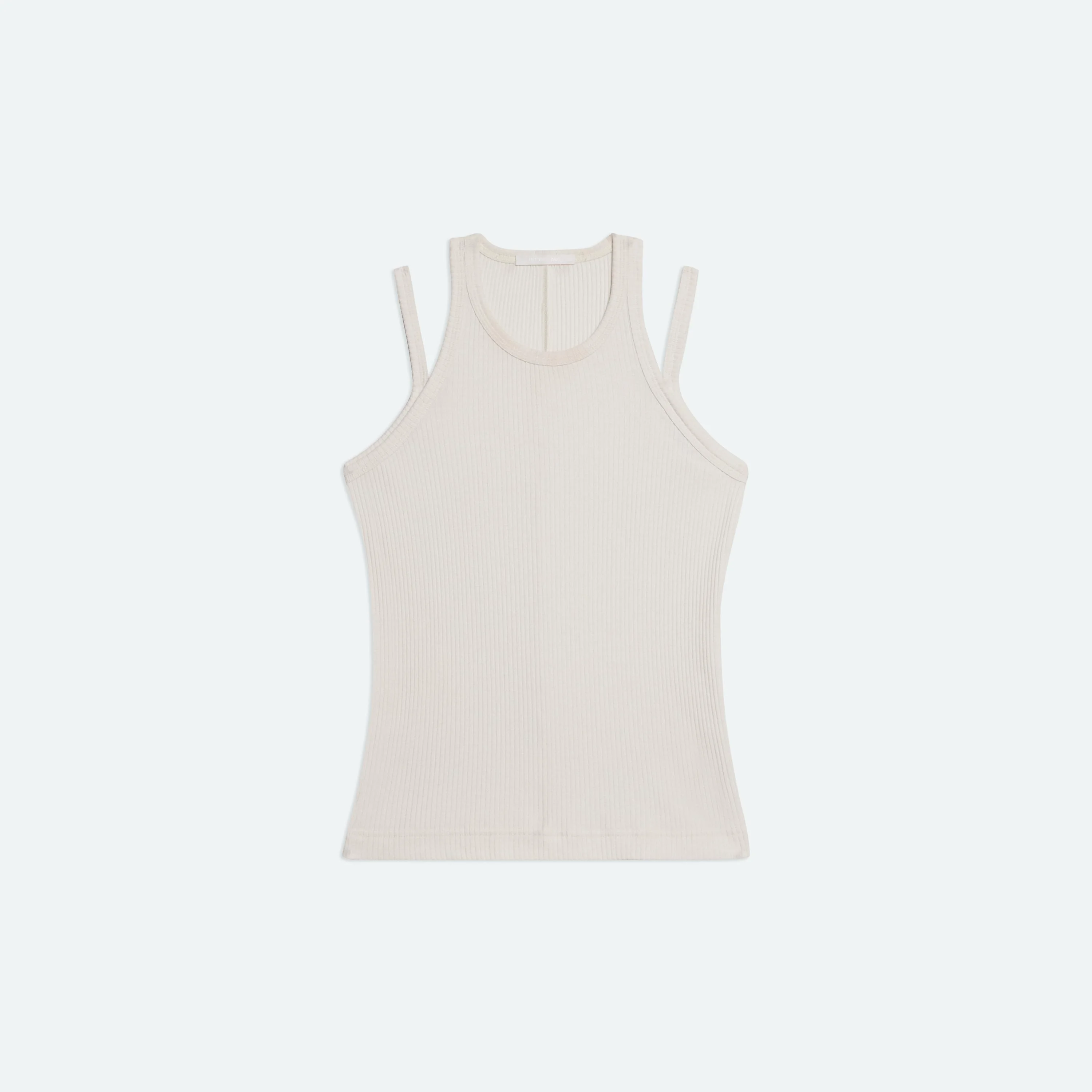 Classic ribbed tank top with doubled strap detail. Fits true to size. Model is 5'11" and wears size S. DETAILS - Crewneck - Racerback - Double strap on shoulders - Slim fit - P09HW504 MATERIALS & CARE - Composition: 95% cotton, 5% spandex - Machine wash cold gentle cycle, with like colors. Do not bleach. Tumble dry low. Cool iron if needed. Do not dry clean. - Finished Garment Manufacturing Country/Region: Peru - Fabric Production Country/Region: Peru - Weaving Country/Region: (of fabric) Peru - Dyeing Country/Region: (of fabric) Peru - Finishing Country/Region: (of fabric) Peru