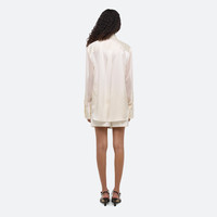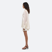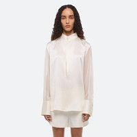 Silk shirt with sheer sleeves. Open the collar to reveal a draped cowl neckline in sheer chiffon. Fits true to size. Model is 5’10” and wears size S. DETAILS - Stand collar - Sheer cowl neckline - Sheer chiffon sleeves - Tuxedo cuffs - Metal-wrapped logo buttons - Relaxed fit - P04HW509 MATERIALS & CARE - Composition: 100% silk - Do not wash. Do not bleach. Do not tumble dry. Cool iron if needed. Dry clean with any solvent except trichloroethylene. - Finished Garment Manufacturing Country/Region: China - Fabric Production Country/Region: China - Weaving Country/Region: (of fabric) China - Dyeing Country/Region: (of fabric) China - Finishing Country/Region: (of fabric) China