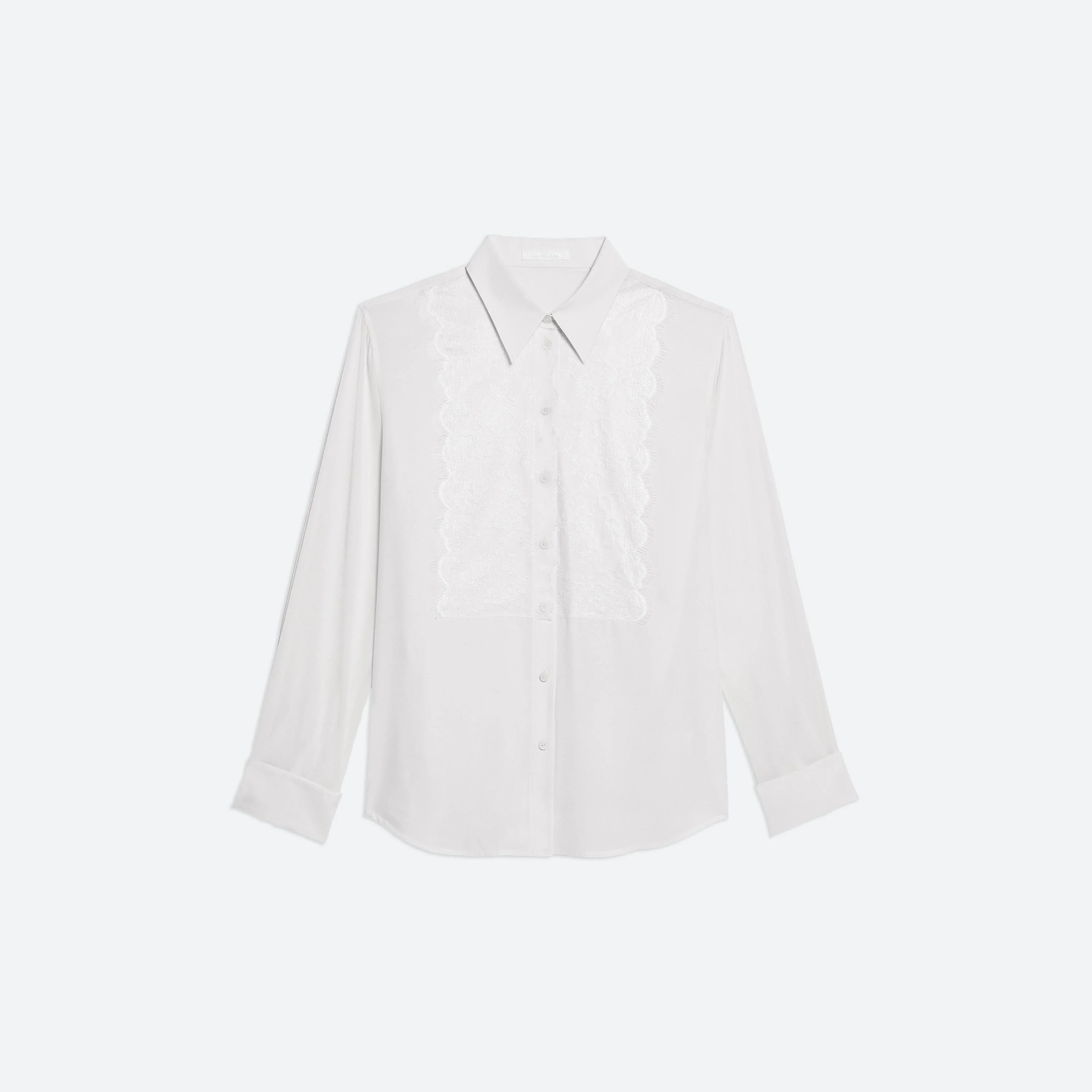 Lightweight tuxedo shirt with lace bib and sheer sleeves. Fits true to size. Model is 5’11” and wears size S. DETAILS - Pointed collar - Tonal lace bib - Button front closure and cuffs - Sheer sleeve with tuxedo cuffs - Adjustable waist strap - Shirttail hem - Relaxed fit - O09HW505 MATERIALS & CARE - Composition: 100% Recycled Polyester - Professional dry clean only. - Finished Garment Manufacturing Country/Region: China - Fabric Production Country/Region: China - Weaving Country/Region: (of fabric) China - Dyeing Country/Region: (of fabric) China - Finishing Country/Region: (of fabric) China