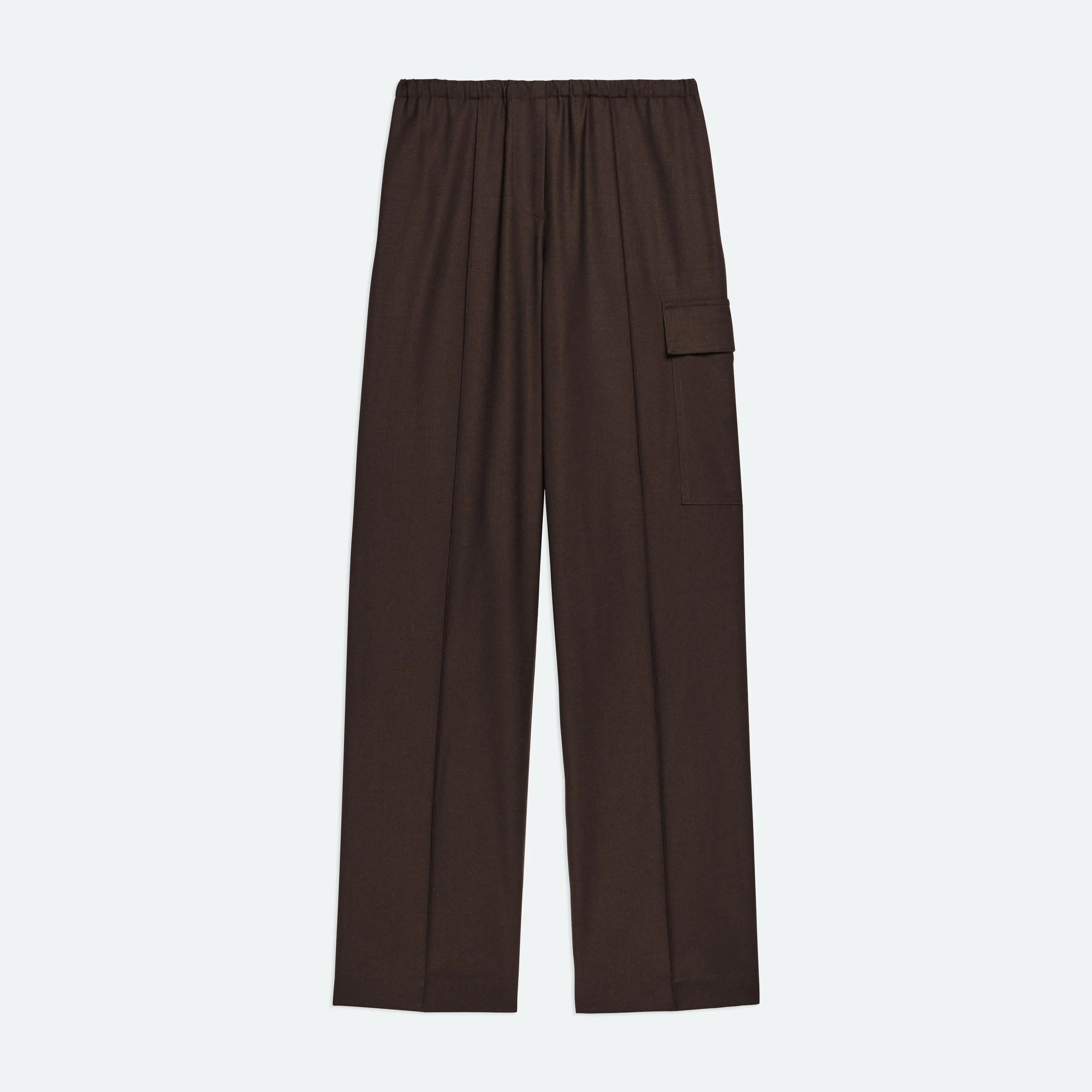 Straight-leg trousers in wool. Cut with a relaxed fit and finished with a minimal elastic waistband. Matches the Cutaway Blazer. Fits true to size. Model is 5'11" and wears size 2. DETAILS - Mid-rise - Slim elastic waistband with interior drawstring - Zip fly with hook and bar closure - Pintucked crease on front - Cargo pocket on left - Slip pockets on sides - Welt back pockets with metal logo clip - 32 ½” inseam and 19 ¾” leg opening - P06HW201 MATERIALS & CARE - Composition: 100% wool - Professional dry clean only. - Finished Garment Manufacturing Country/Region: Vietnam - Fabric Production Country/Region: China - Weaving Country/Region: (of fabric) China - Dyeing Country/Region: (of fabric) China - Finishing Country/Region: (of fabric) China