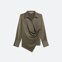Wrap-front shirt in a fluid satin crepe. Adjust the depth of the wrap to control the amount of coverage, wear as a cowl neck, or leave open for a draped look. Fits true to size. Model is 5’11” and wears size S. DETAILS - Pointed collar - Buttons at side and collar for adjustable fit - Tuxedo cuffs - Relaxed fit - O09HW501 MATERIALS & CARE - Composition: 82% Triacetate, 18% Polyester - Professional dry clean only. Cool iron and light steam if needed light steam. - Finished Garment Manufacturing Country/Region: China - Fabric Production Country/Region: Japan - Weaving Country/Region: (of fabric) Japan - Dyeing Country/Region: (of fabric) Japan - Finishing Country/Region: (of fabric) Japan