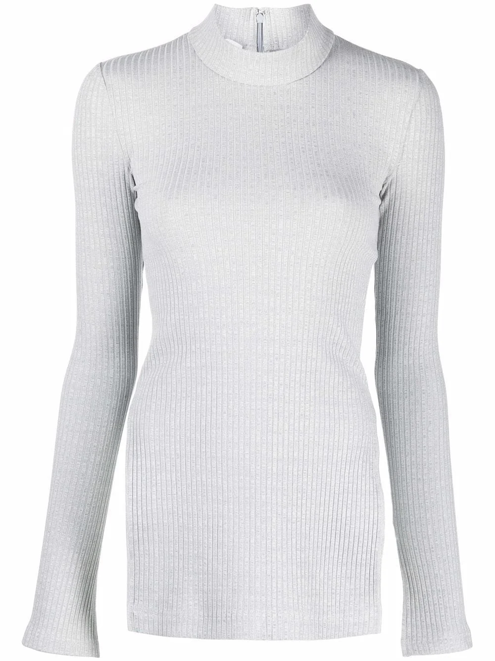 ribbed-knit long-sleeve top melange grey ribbed knit stretch-design mock neck concealed rear zip fastening long sleeves side slits straight hem Imported Composition Viscose 45%, Nylon 27%, Polyester 23%, Spandex/Elastane 5% SIZE & FIT Model measurements Height 5 ft 10 in(1.77 m) Bust/Chest 35.03 in(89 cm) Hips 35.03 in(89 cm) Waist 23.62 in(60 cm) FittingInformation This piece fits true to size. We recommend you get your regular size Cut for a slim fit Made with a mid-weight stretch fabric Washing instructions Hand Wash