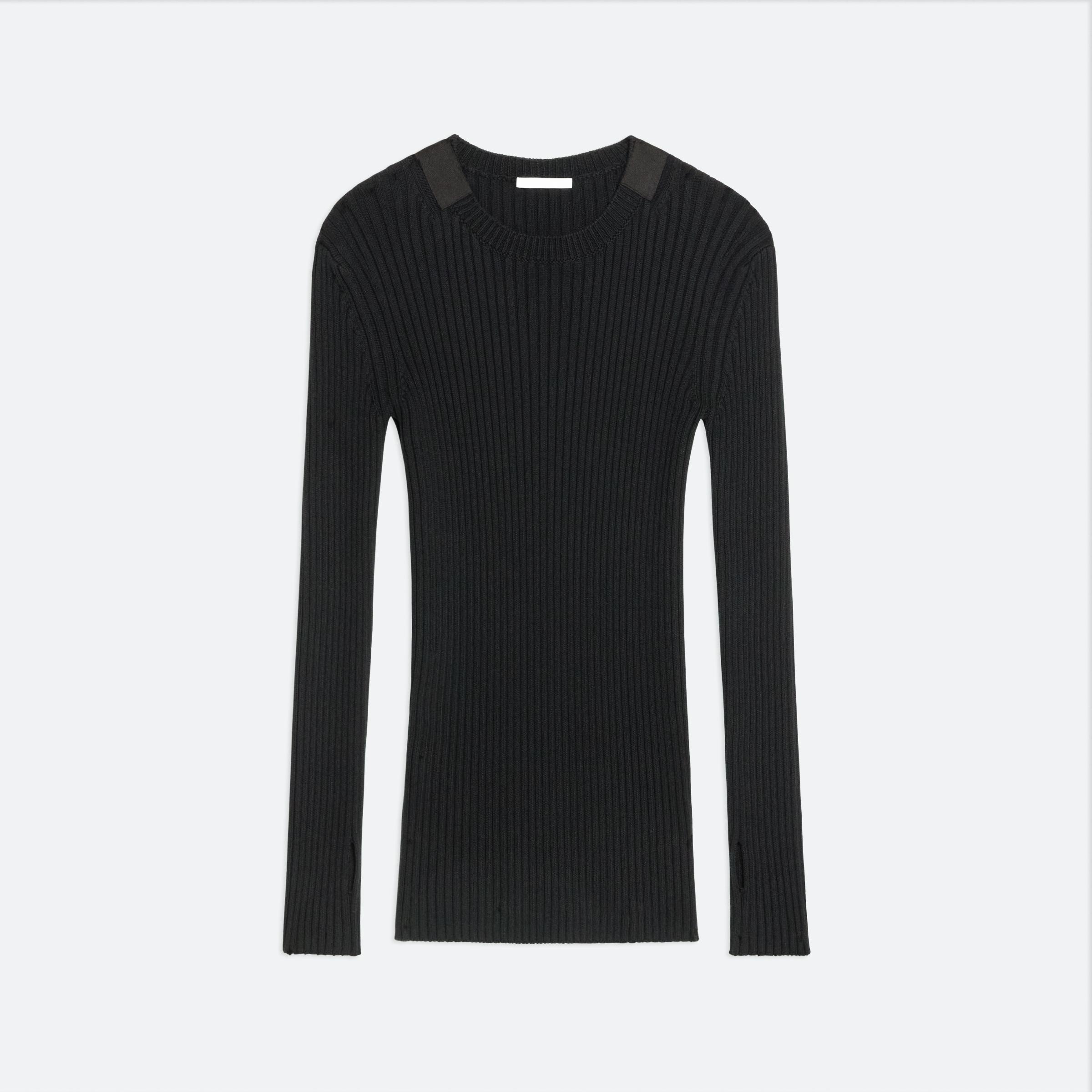 Relaxed rib top with cotton herringbone tapes topstitched along both sides of the neck. Sleeves have cut-outs at the elbow and thumbhole. This garment was designed with many body types and gender expressions in mind. Male Model is 6’2” and is wearing size M Female Model is 5’9” and is wearing size S DETAILS - Crew neckline - Long sleeves - Elbow cut-outs - Thumbhole cut-outs - Relaxed fit - O01HM701 MATERIALS & CARE - Composition: 100% Cotton - Dry clean, Normal cycle, any solvent except trichloroethylene - product.sustainability.label.manufactureCountry China - product.sustainability.label.COOCountry Italy - product.sustainability.label.DyeingCountry Turkey - product.sustainability.label.FinishingCountry Turkey - product.sustainability.label.Spinningcountry Turkey