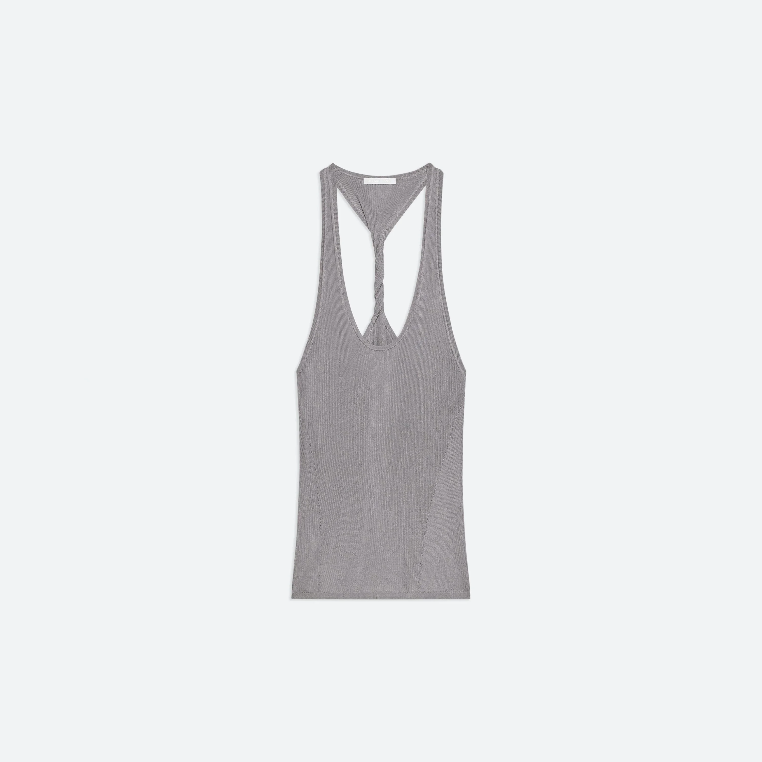 Scoop-neck tank in viscose rib. Slim fit with a twisted racer-cut back. Fits true to size. Model is 5’10” and wears size S. DETAILS - Scooped neck - Twisted racerback - P04HW705 MATERIALS & CARE - Composition: 88% viscose, 12% nylon - Dry clean with any solvent except trichloroethylene. - Finished Garment Manufacturing Country/Region: China - Fabric Production Country/Region: China - Dyeing Country/Region: (of fabric) China - Finishing Country/Region: (of fabric) China - Spinning: (of fabric) China
