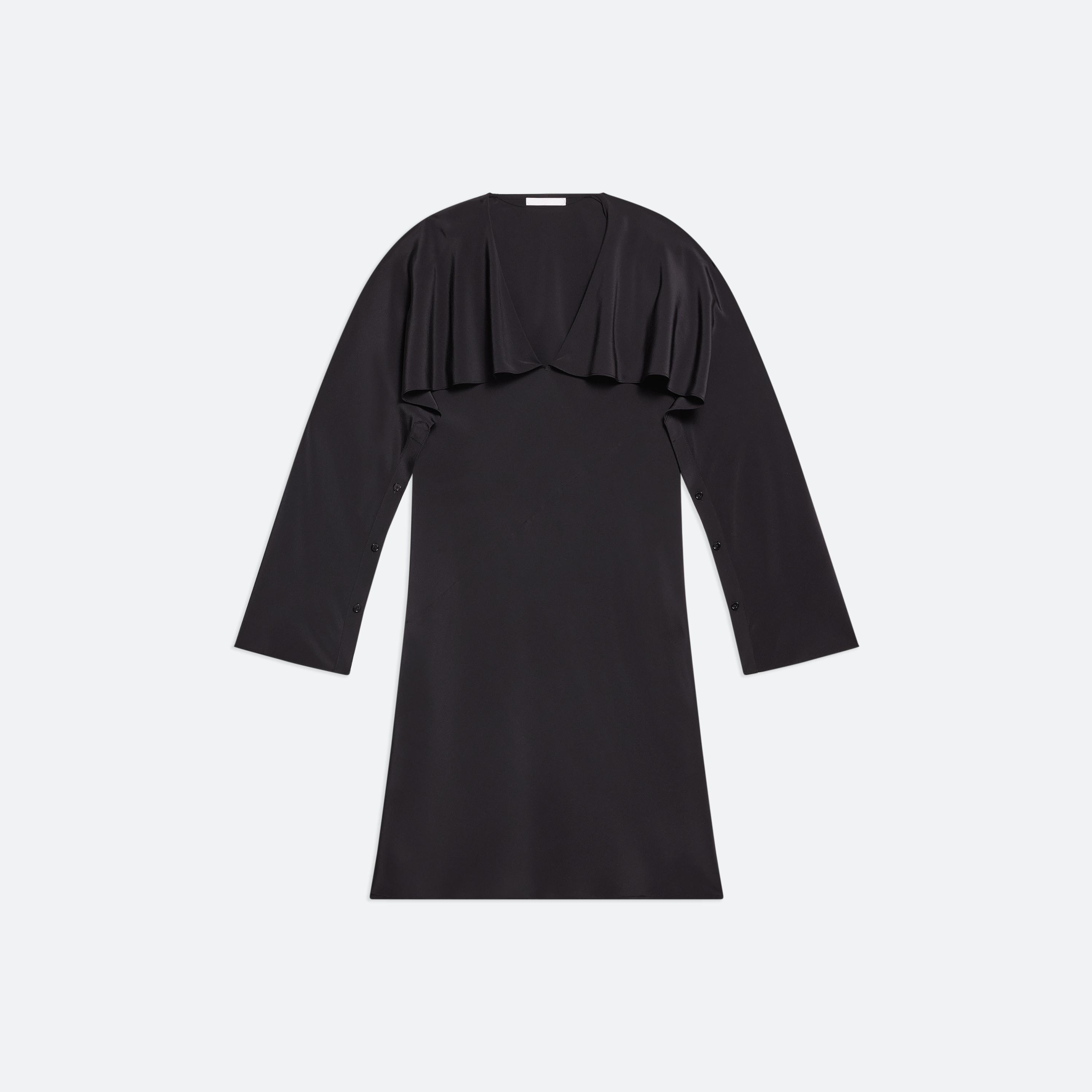 Bias-cut dress in silk crepe de chine, with draped sleeves attached at the neckline. Unbutton to wear the sleeves loose like a cape, or wrapped as a scarf. Fits true to size. Model is 5’11” and wears size S DETAILS - Bias-cut silk - Modular cape sleeves - Hidden button placket on sleeves - Relaxed fit - O06HW603 MATERIALS & CARE - Composition: 100% Silk - Professional dry clean only. Do not steam. - Finished Garment Manufacturing Country/Region: China - Fabric Production Country/Region: China - Weaving Country/Region: (of fabric) China - Dyeing Country/Region: (of fabric) China - Finishing Country/Region: (of fabric) China