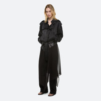 Double-breasted silk trench coat with leather details and a sheer chiffon handkerchief hem. Finished with classic trench details like storm flaps and epaulets at the shoulder. Fits true to size. Model is 5’10” and wears size S. DETAILS - Notched lapels - Silk body with sheer skirt - Leather detailing throughout - Asymmetrical storm flap detail - Leather-faced tie belt - Adjustable button closure on sleeves - P04HW402 MATERIALS & CARE - Composition: 100% silk; lining: 100% viscose - Do not wash. Do not bleach. Do not tumble dry. Cool iron if needed. Dry clean with any solvent except trichloroethylene. - Finished Garment Manufacturing Country/Region: China