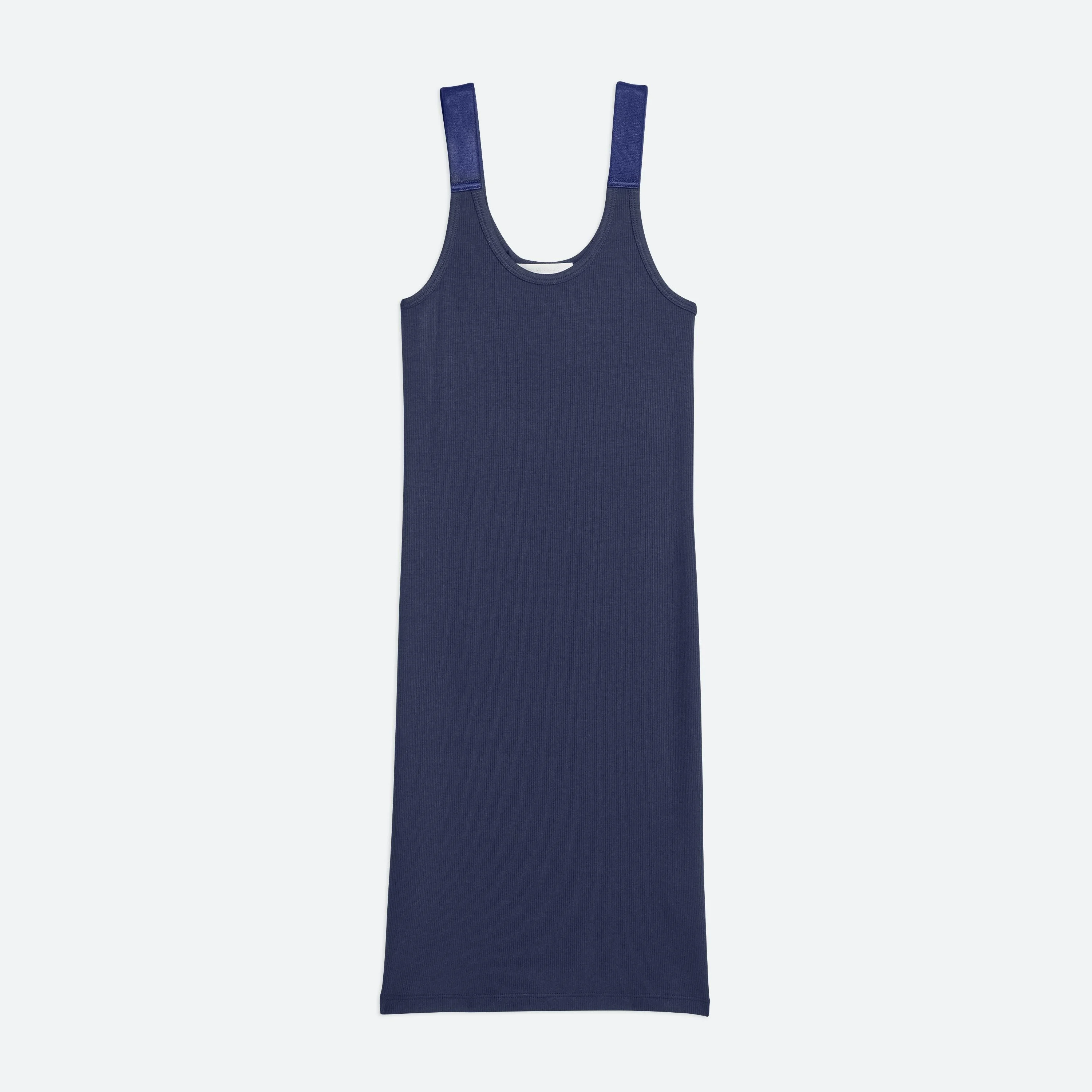Tank dress in ultra-fine modal rib with signature seatbelt strap detail at shoulder. Fits true to size. Model is 5’9” and is wearing size S DETAILS - Scooped neck - Sleeveless style with slight racerback - Seatbelt details at shoulder - O04HW607 MATERIALS & CARE - Composition: 95% Modal, 5% Spandex - Machine wash cold with like colors. Do not bleach. - Tumble dry low. - Finished Garment Manufacturing Country/Region: Peru - Fabric Production Country/Region: Peru - Weaving Country/Region: (of fabric) Peru - Dyeing Country/Region: (of fabric) Peru - Finishing Country/Region: (of fabric) Peru