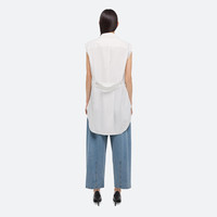 Sleeveless shirt in soft cotton poplin with an exaggerated tail. Curved seams wrap around the body, emphasizing the relaxed fit. Adjust the waist tab for a more fitted look. Fits true to size. Model is 5’11” and wears size S. DETAILS - Pointed collar - Patch pocket - Muscle sleeve - Button front closure - Shirt tail with central vent - Adjustable waist tab - Relaxed fit - O10HW502 MATERIALS & CARE - Composition: 100% Cotton - Professional dry clean only. - Finished Garment Manufacturing Country/Region: China - Fabric Production Country/Region: Japan - Weaving Country/Region: (of fabric) Japan - Dyeing Country/Region: (of fabric) Japan - Finishing Country/Region: (of fabric) Japan