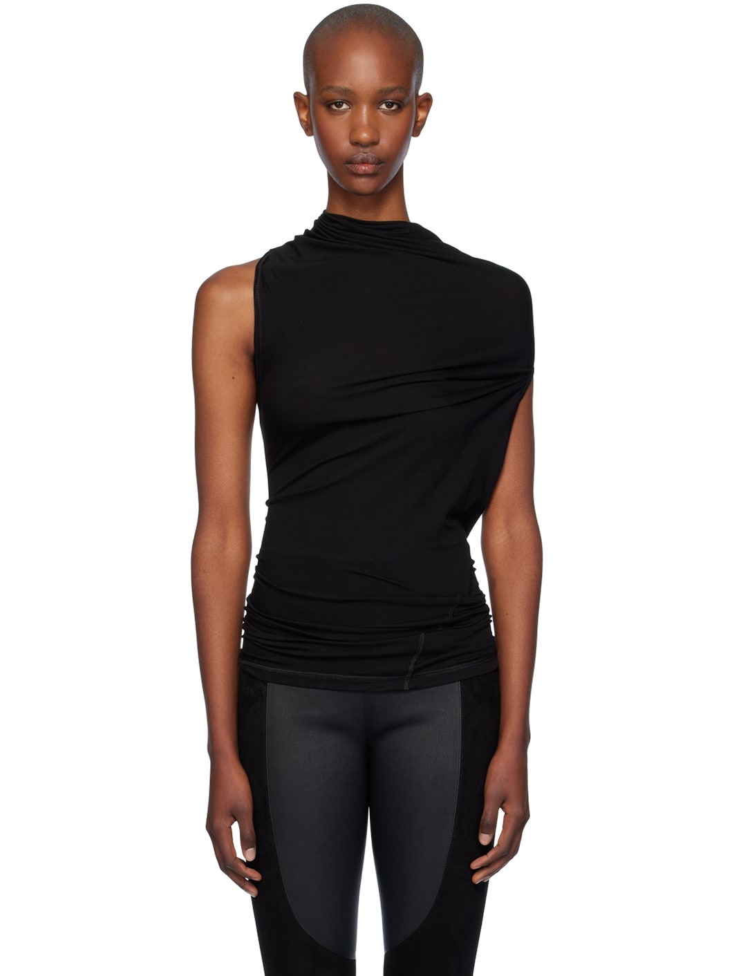 Semi-sheer stretch lyocell jersey top. Draping throughout. · Asymmetrical construction · Cowl neck · Knot at open back Supplier color: Black