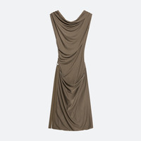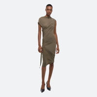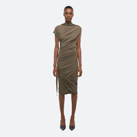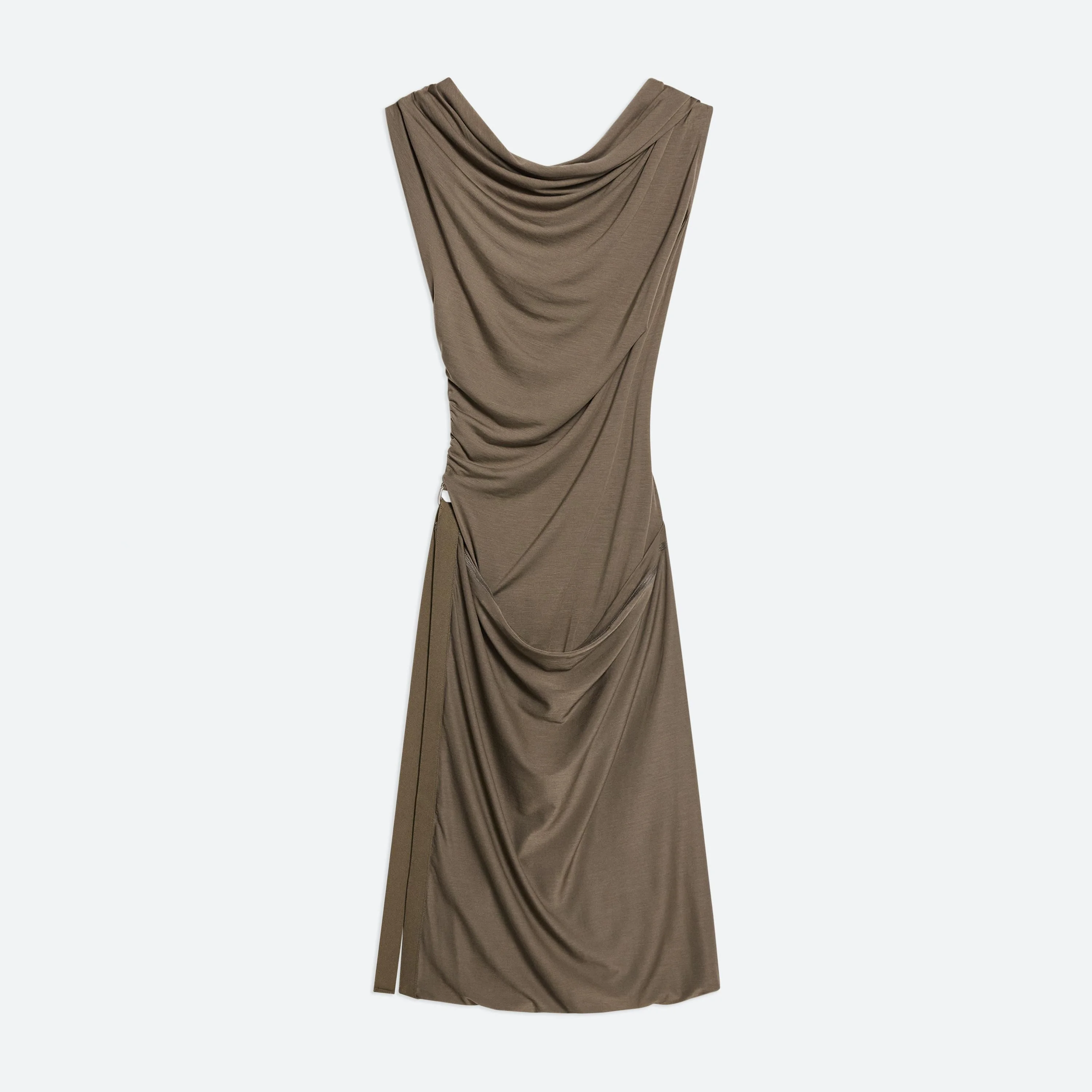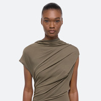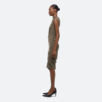 Sleeveless dress in soft lyocell jersey, draped to mimic the way fabric moves against the wind. Style the neckline as a bateau or a racerback. A tonal seatbelt strap allows the skirt to be worn as a mini or let down for more coverage. Fits true to size. Model is 5’11” and wears size S. DETAILS - High neck - Adjustable draped neckline - Tonal elastic seatbelt controls skirt length - O09HW602 MATERIALS & CARE - Composition: 94% Lyocell, 6% Elastane - Machine wash cold on gentle with like colors. Do not bleach. Do not tumble dry. Lay flat to dry. Cool iron if needed. Do not dry clean. - Finished Garment Manufacturing Country/Region: China - Fabric Production Country/Region: Portugal - Weaving Country/Region: (of fabric) Portugal - Dyeing Country/Region: (of fabric) Portugal - Finishing Country/Region: (of fabric) Portugal