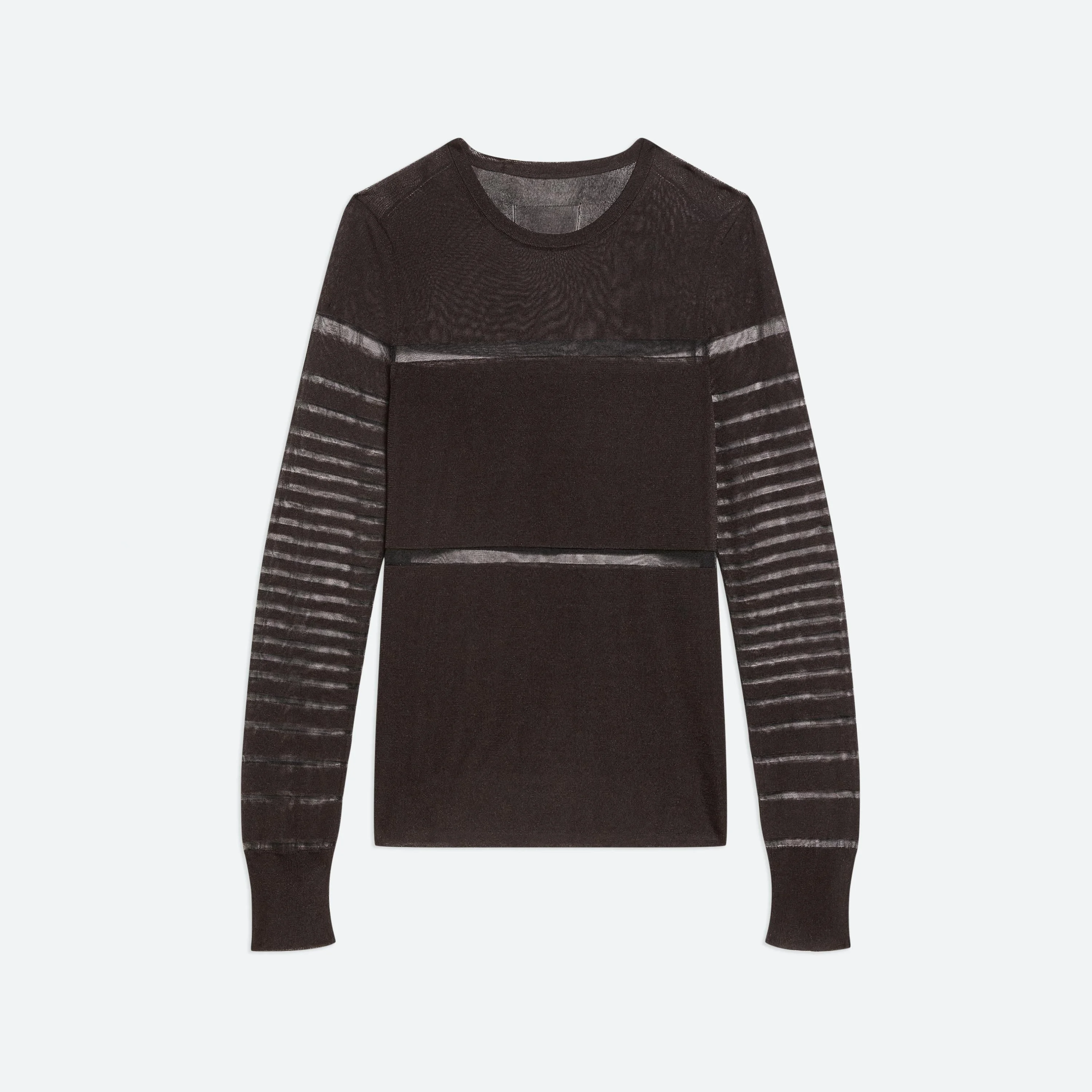 Crewneck tee with sheer stripe detail in a lightweight viscose knit. Fits true to size. Model is 5’10” and wears size S. DETAILS - Crewneck - Long sleeves - Slim fit - P05HW708 MATERIALS & CARE - Composition: 88% viscose, 12% nylon - Dry clean with any solvent except trichloroethylene. - Finished Garment Manufacturing Country/Region: China - Fabric Production Country/Region: China - Dyeing Country/Region: (of fabric) China - Finishing Country/Region: (of fabric) China - Spinning: (of fabric) China