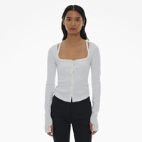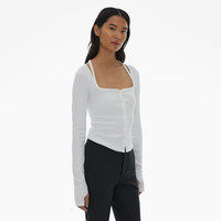 The Helmut Lang Cardigan is a slim-fitting style in cotton rib knit with a square neckline with slash details, button front closures, long sleeves with thumbhole details. DETAILS - 100% Cotton - Square neckline with slash details - Long sleeves with thumbhole details - Button front closures - Imported - N02HW505 CARE - Machine wash cold separately, gentle cycle - Do not soak, bleach, wring, or tumble dry - Lay flat to dry - Cool iron or dry clean if needed FIT - Fits true to size - Michelle is 5’9.5” and is wearing size S