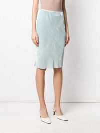 textured high-waisted pencil skirt Light blue silk blend textured high-waisted pencil skirt from Helmut Lang featuring a textured style, a high waist, a mid-length and a concealed fastening. Imported Composition Outer: Viscose 82%, Silk 18% Lining: Polyester 100% SIZE & FIT Model measurements Height 5 ft 11 in(1.8 m) Bust/Chest 31.88 in(81 cm) Hips 35.03 in(89 cm) Waist 24.01 in(61 cm) Measurement HIPS 37.79 in(96 cm) LENGTH 25.98 in(66 cm) WAIST 30.7 in(78 cm) FittingInformation This piece fits true to size. We recommend you get your regular size Cut for a slim fit Made with a lightweight non-stretch fabric Washing instructions Dry Clean Only