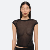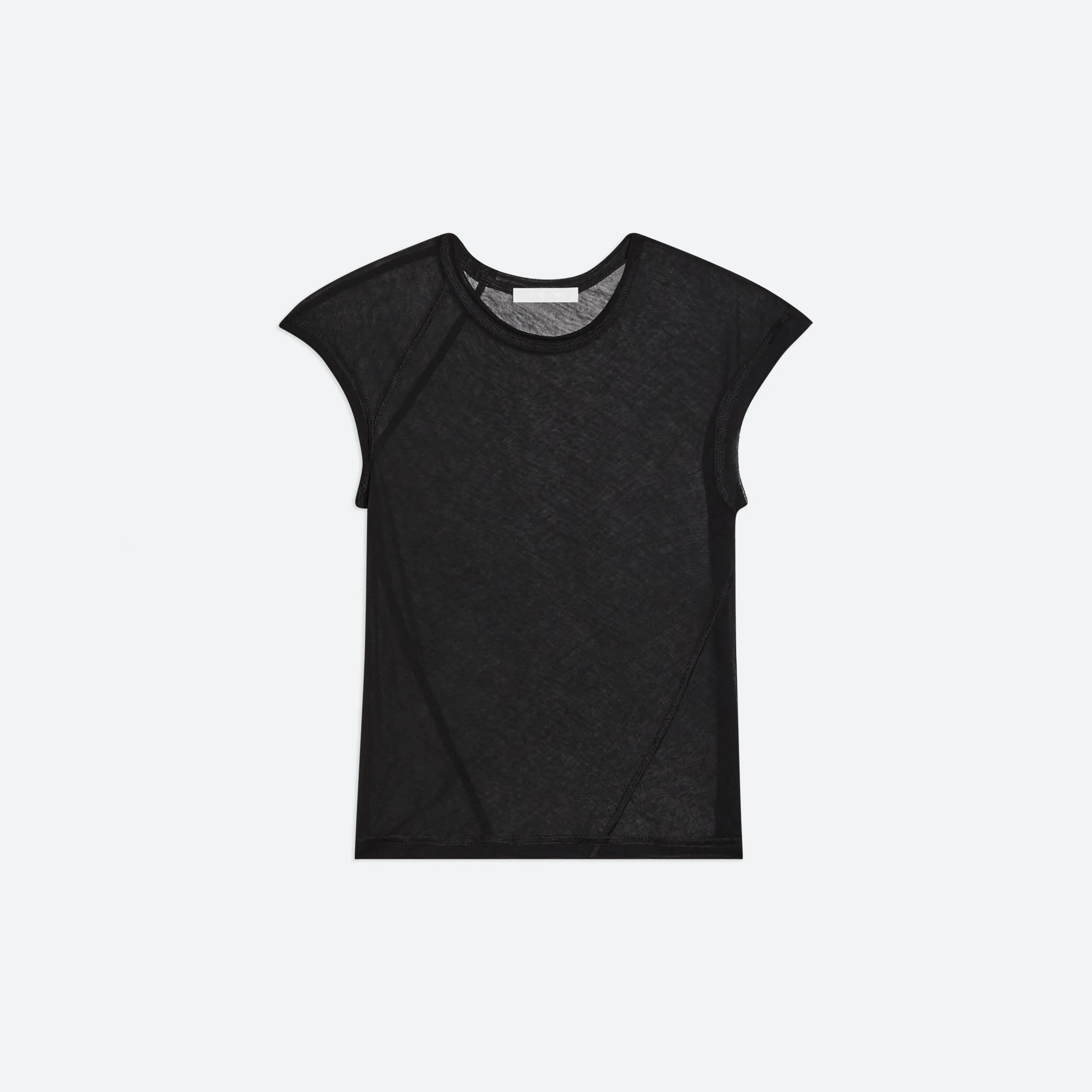 Cropped baby tee in sheer knit. Seams wrap around the body for a close fit. Fits true to size. Model is 5’10” and wears size S. DETAILS - Crewneck - Cap sleeves - Smooth, sheer finish - P01HW505 MATERIALS & CARE - Composition: 100% cotton - Warm iron if needed, professional dry clean only - Finished Garment Manufacturing Country/Region: China - Fabric Production Country/Region: Japan - Weaving Country/Region: (of fabric) Japan - Dyeing Country/Region: (of fabric) Japan - Finishing Country/Region: (of fabric) Japan