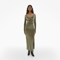 The Helmut Lang Dress is a long sleeve style in two-tones of stretch velvet with a cowl neckline and split hemline. DETAILS - 56% Polyester, 34% Nylon, 10% Spandex - Cowl neckline - Long sleeves - Asymmetrical split hemline - Ruched details - Imported - N07HW601 CARE - Professional dry clean only FIT - Fits true to size - Rocio is 5’10” and is wearing size S