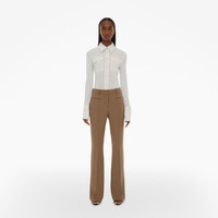 The Helmut Lang Bootcut Pant is a slim-fitting flared style paneled in a stretch wool-blend twill with hip besom pockets, side vented hems, a zip fly, and hook closure. DETAILS - 53% Polyester, 43% Virgin Wool, 4% Elastane - Zip fly and hook closure - Hip besom pockets - Side vented hems - Imported - N10HW204 CARE - Professional dry clean only FIT - Fits true to size - Model is 5’10” and is wearing size 2