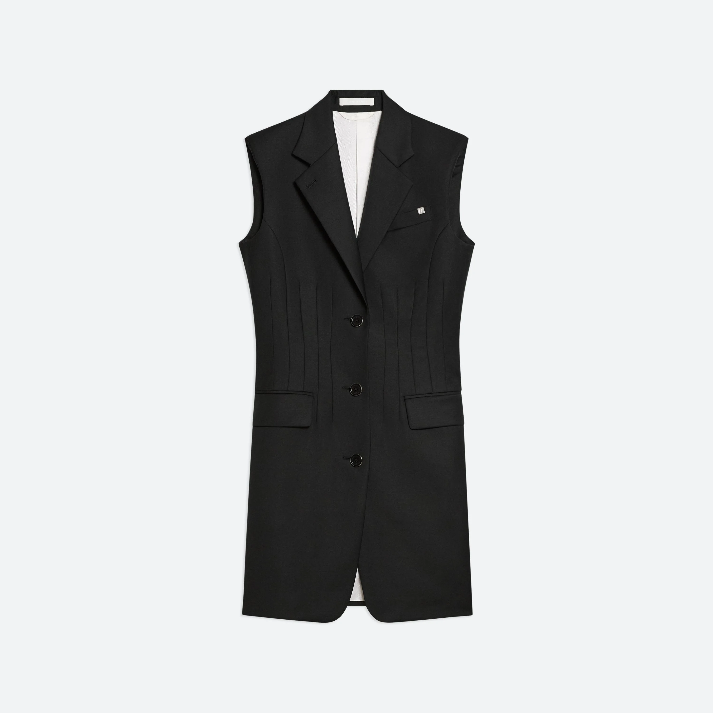 Tailored blazer dress with a fitted waist sculpted by darts. Made in wool twill with notched lapels and waist flap pockets. Fits true to size. Model is 5’10” and wears size 2. DETAILS - Notched lapels - Button front closure - Waist flap pockets - Welt pocket with metal logo clip - Metal-wrapped logo buttons - Fitted at waist - Fully lined - P02HW601 MATERIALS & CARE - Composition: 100% wool; lining: 100% viscose - Do not wash, do not bleach, do not tumble dry, cool iron if needed, professional dry clean with petroleum solvent only - Finished Garment Manufacturing Country/Region: China - Fabric Production Country/Region: China - Weaving Country/Region: (of fabric) China - Dyeing Country/Region: (of fabric) China - Finishing Country/Region: (of fabric) China