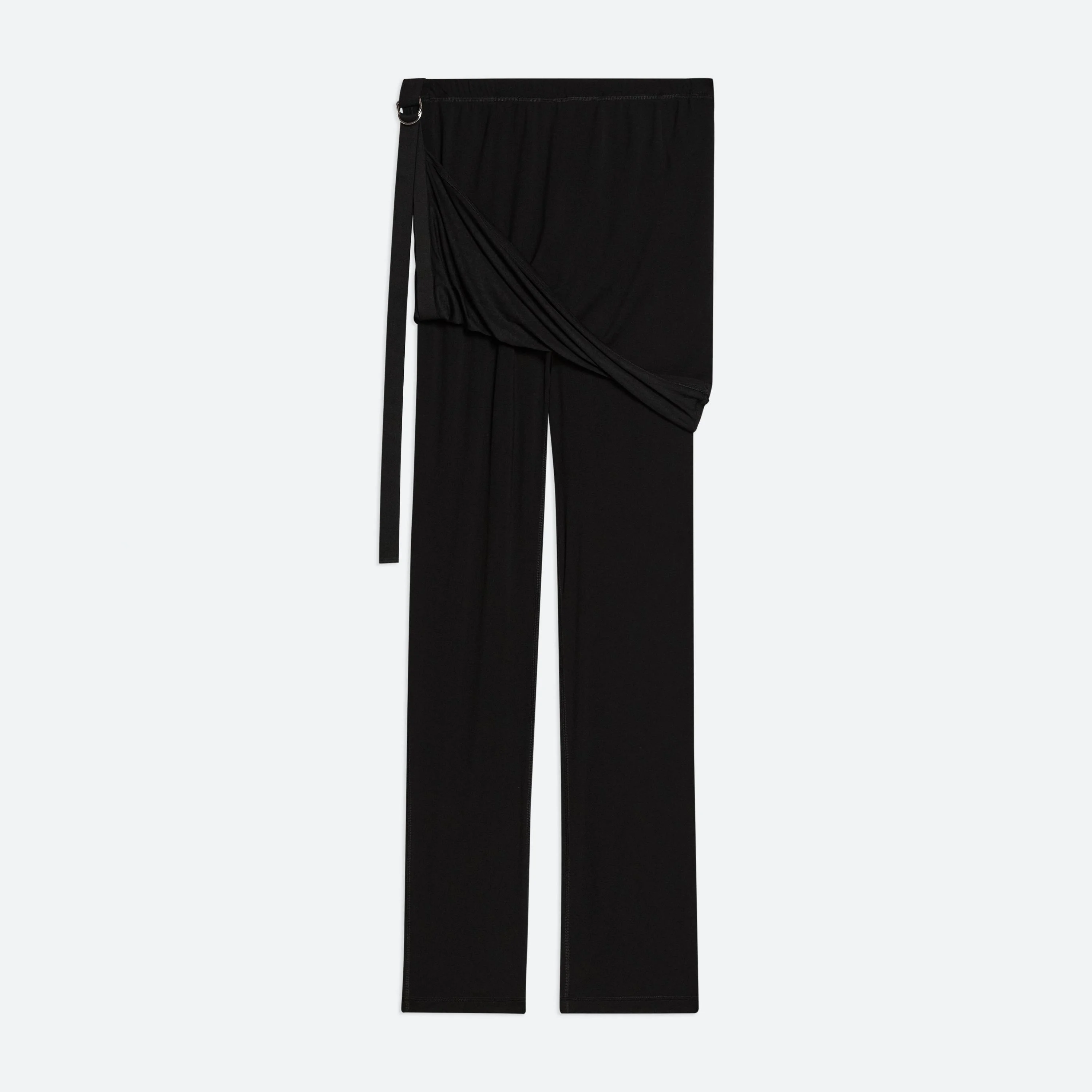 Slim pants in soft lyocell jersey with attached skirt. Use the tonal seatbelt strap to adjust the length of the skirt. Fits true to size. Model is 5’11” and wears size S. DETAILS - Slim fit - Attached skirt - Elasticized waistband - Mid-rise - Tonal elastic seatbelt controls skirt length - 31 ½” inseam and 14 ¾” leg opening - P01HW203 MATERIALS & CARE - Composition: 94% lyocell, 6% elastane - Machine wash cold, gentle cycle, with similar colors, do not bleach, lay flat to dry in shade, do not tumble dry, cool iron if needed, do not dry clean - Finished Garment Manufacturing Country/Region: China - Fabric Production Country/Region: Portugal - Weaving Country/Region: (of fabric) Portugal - Dyeing Country/Region: (of fabric) Portugal - Finishing Country/Region: (of fabric) Portugal