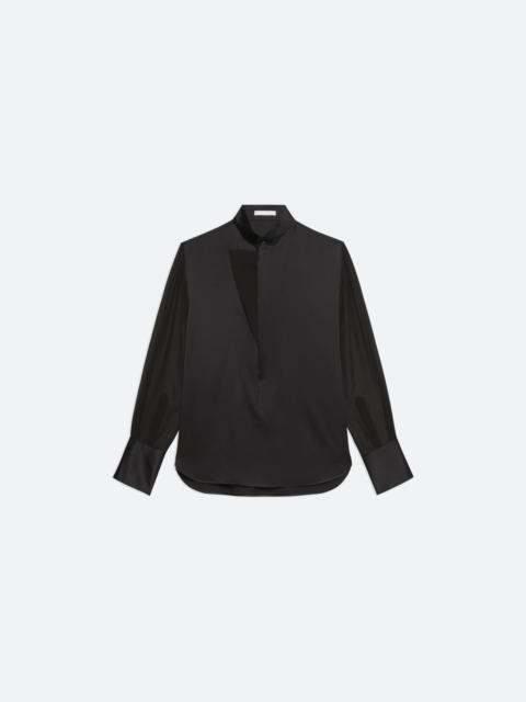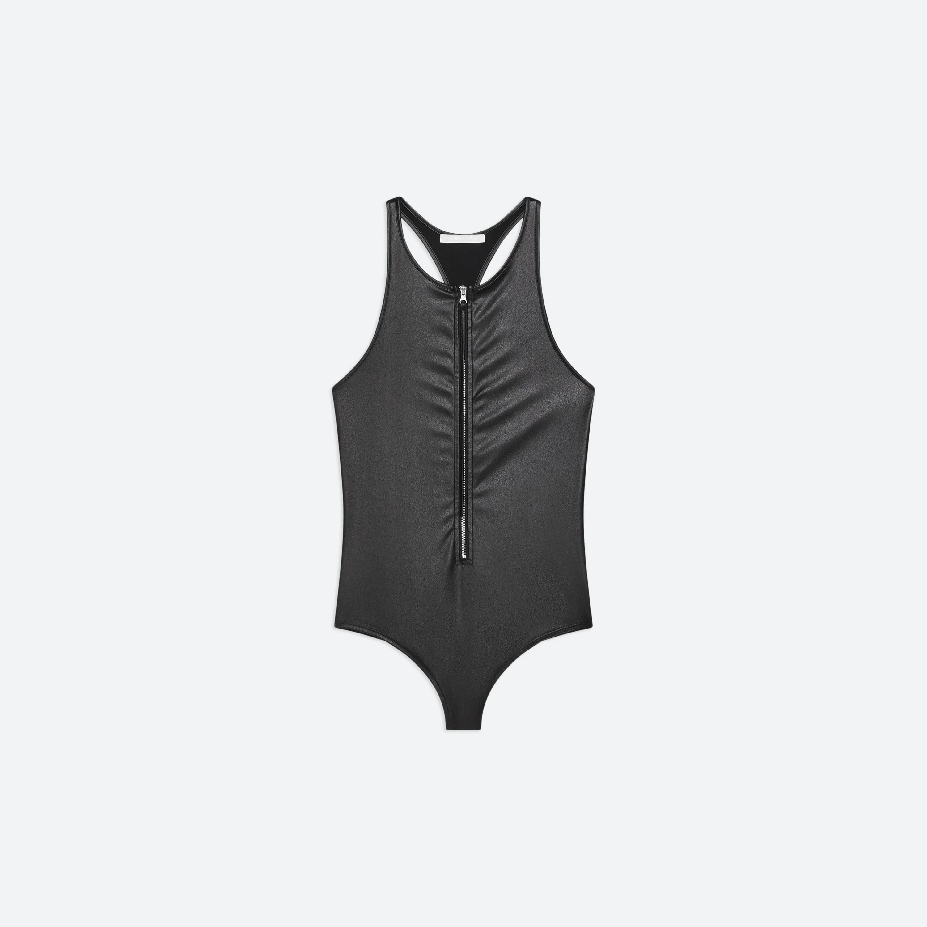 Zip-front bodysuit in stretch vegan leather. Back panel cut from a dense, structured ponte knit for an easy fit. Fits true to size. Model is 5’10” and wears size S. DETAILS - Elongated front zip - Crewneck - Racerback - Snap closure at base - Vegan leather front - Knit ponte back - P04HW502 MATERIALS & CARE - Composition: 100% recycled polyester - Professional dry clean with any solvent except trichloroethylene. Cool iron on reverse side only. - Finished Garment Manufacturing Country/Region: China - Fabric Production Country/Region: product.sustainability.country.hk.label - Weaving Country/Region: (of fabric) Korea (South) - Dyeing Country/Region: (of fabric) Korea (South) - Finishing Country/Region: (of fabric) Korea (South)