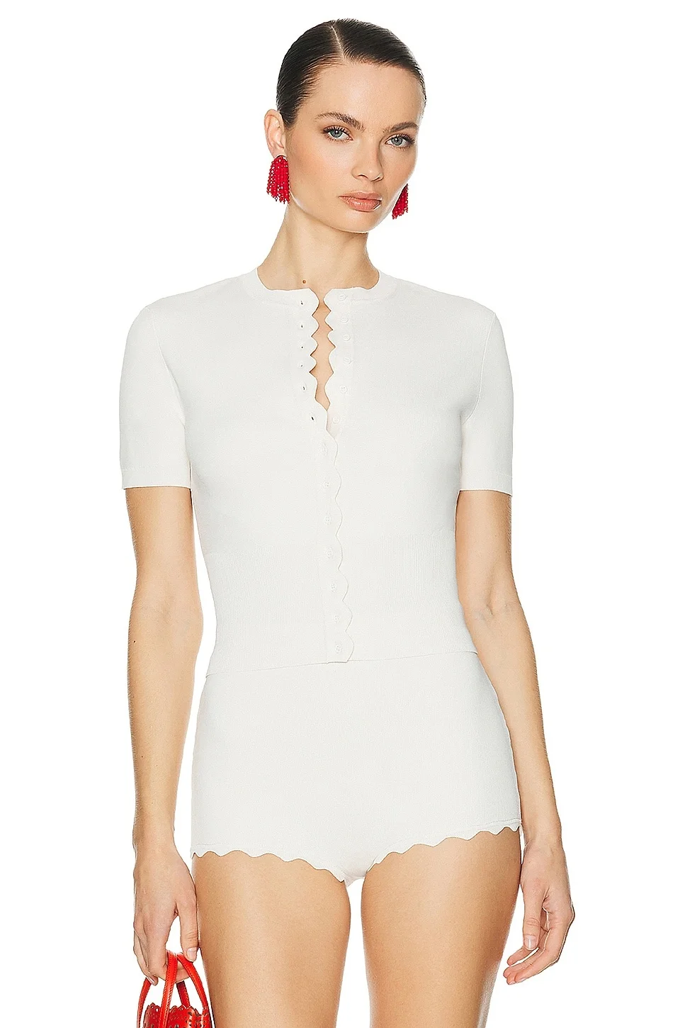 Details - 70% viscose, 14% polyester, 13% nylon, 3% elastane - Made in China - Hand wash - Front button closure - Cinched ribbed hem - Midweight ribbed knit fabric with scalloped trims - Item not sold as a set - Our Style No. HLSA-WS94 - Manufacturer Style No. HES64 S24