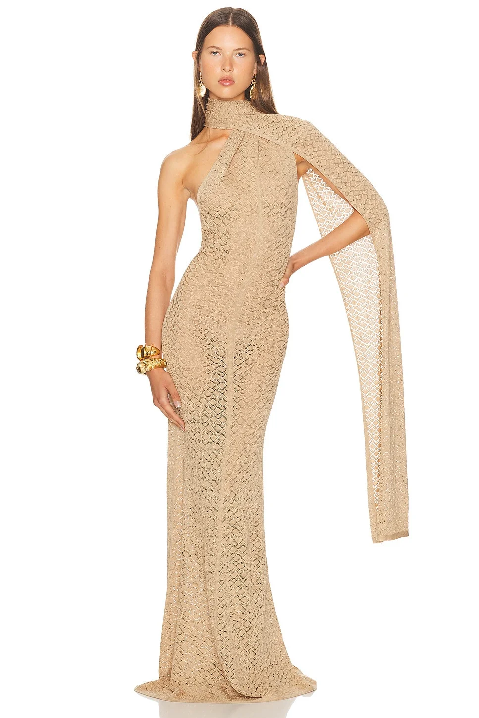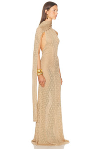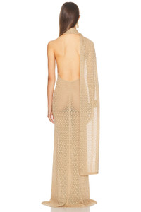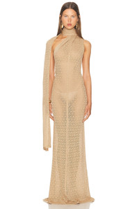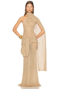 Details - 80% viscose, 20% nylon - Dry clean only - Unlined - Pull-on styling with wraparound scarf design - Open back - Lightweight knit fabric - Garment is made with a semi-sheer fabric, undergarments can show through - Made in China - Our Style No. HLSA-WD224 - Manufacturer Style No. HED10014 U25