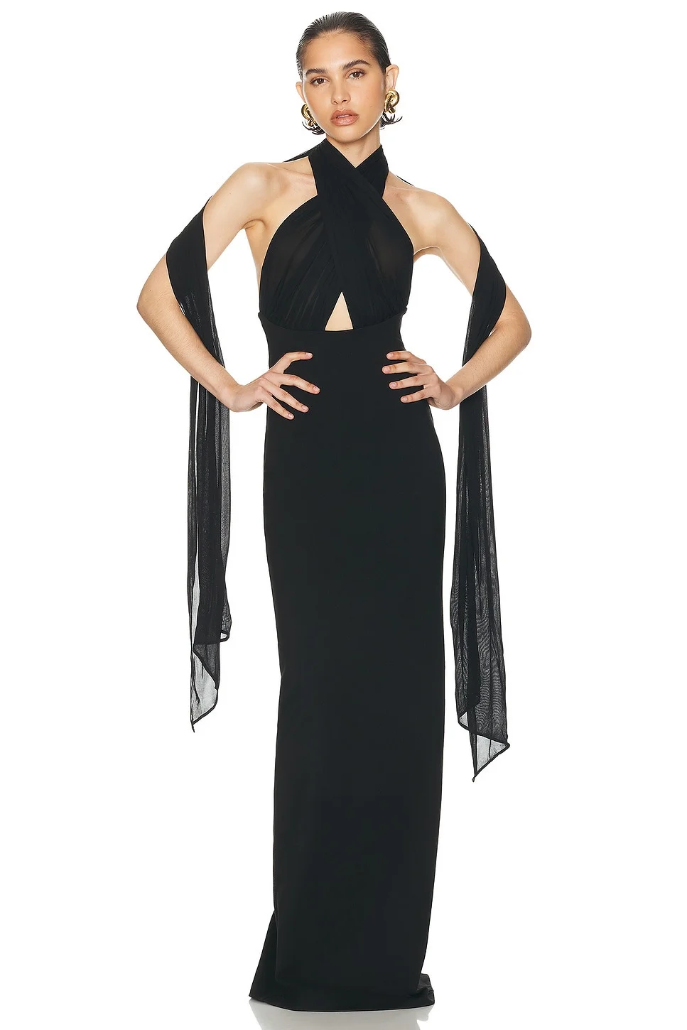 Details - Self: 68% rayon, 27% nylon, 5% spandex - Contrast Fabric: 100% viscose - Made in China - Hand wash - Unlined - Hidden back zipper closure - Adjustable top with back tie closure - Sheer mesh upper with ponte lower - Garment is intentionally sheer, undergarments will show through. - Our Style No. HLSA-WD86 - Manufacturer Style No. HED78 U24