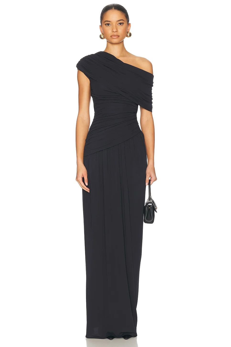 Details - 100% viscose - Made in Turkey - Dry clean only - Unlined - Hidden side zipper closure - Off-shoulder design - Jersey fabric with ruching detail - Our Style No. HLSA-WD169 - Manufacturer Style No. HED131 S25