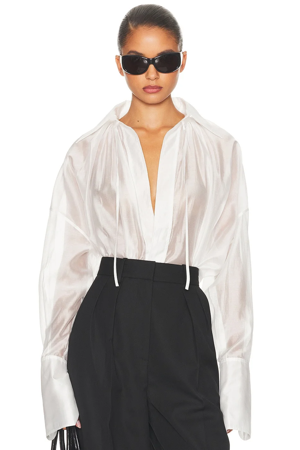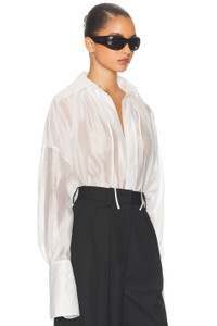 Details - 85% lyocell, 15% polyester - Hand wash - Pull-on styling with front tie-up accent - Buttoned cuffs - Lightweight voile fabric - Garment is made with a semi-sheer fabric, undergarments can show through - Made in China - Our Style No. HLSA-WS204 - Manufacturer Style No. HES10020 F25