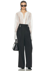 - 85% lyocell 15% polyester - Hand wash - Pull-on styling with front tie-up accent - Buttoned cuffs - Lightweight voile fabric - Garment is made with a semi-sheer fabric, undergarments can show through - Revolve Style No. HLSA-WS204 - Manufacturer Style No. HES10020 F25
