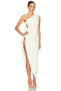 Details - Self: 96% viscose, 4% elastane - Lining: 100% polyester - Made in China - Dry clean only - Fully lined - Side tie-up closures - Cut-out detail at side - Crepe fabric with asymmetrical hem - Our Style No. HLSA-WD187 - Manufacturer Style No. HED150 S25